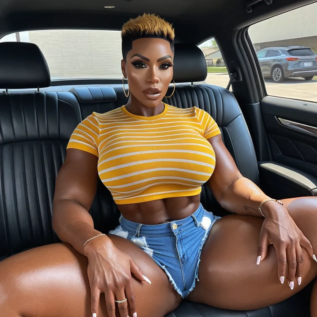 Generate Gorgeous female boss , bimbo , very dark-skinned African-American female , hourglass body , abnormally massive female bodybuilder , gorgeous , close up , full lips , big booty , brown , on face and breast , short pixie hair , big lipsfeminine silhouette , too big breast , big booty , sexy thighs abs , silhouette , up close , flexing biceps , beautiful green eyes , legs are iconic and defining physical feature , both visually and in terms of combat ability.wearing an outfit that is a striking blend of elegance , power , and femininity , designed to command attention in any room. The suit is tailored to perfection , hugging the wearer’s curves with precision while emphasizing a structured silhouette. The fabric itself is a refined grey tweed patterned with subtle white grid lines , giving the suit a texture that feels both sophisticated and modern. The blazer features broad blue lapels and gold button accents , adding a luxurious touch that elevates the look beyond typical business attire. The matching high-waisted trousers elongate the frame , further enhancing the poised and commanding effect of the ensemble.The styling choices amplify the boldness of the suit. The inner blouse is a silky , greybutton-down shirt that complements the tweed’s tone while introducing a softer , feminine balance to the sharp tailoring of the jacket. The blouse peeks out neatly from under the blazer , maintaining elegance without drawing focus away from the suit’s commanding cut. Accessories are kept minimal yet intentional: a delicate layered gold necklace and hoop earrings that add glimmers of light and luxury without overpowering the outfit. The choice of voluminous , honey-brown braids cascading down her shoulders frames the face with both confidence and glamour , completing the commanding visual.Altogether , this look communicates a blend of authority and allure. It is business-ready yet fashion-forward , balancing corporate structure with vibrant femininity. The color palette blue , grey and gold avoids being overly delicate , instead embracing the richness of texture , structure , and presence. This is the kind of ensemble that speaks to ambition , sophistication , and personal style—ideal for someone who thrives in positions of influence but insists on expressing her individuality with bold elegance. It’s not just clothing—it’s a statement of power wrapped in grace. In luxury living legs that could crush a watermelon , skirt high boots are a bold and striking statement piece , crafted in glossy black patent leather that gives them a sleek , polished finish. Rising to just below the knee , the boots feature three adjustable buckle straps along the shaft , adding both edge and detail to their design. The towering stiletto heel , paired with a thick platform sole , creates an ultra-dramatic silhouette that elongates the leg and exudes power and confidence. With their combination of shine , height , and structure , these boots perfectly balance fierce femininity with high-fashion allure. High cheekbones , prominent jawline , gorgeous big light reflecting hazel eyes , enormous breast , blue and yellow horizontal striped t-shirt , denim shorts , denim sitting in back seat of car , enormous butt , enormous breast , thunder thighs and hips , up close shot ,
