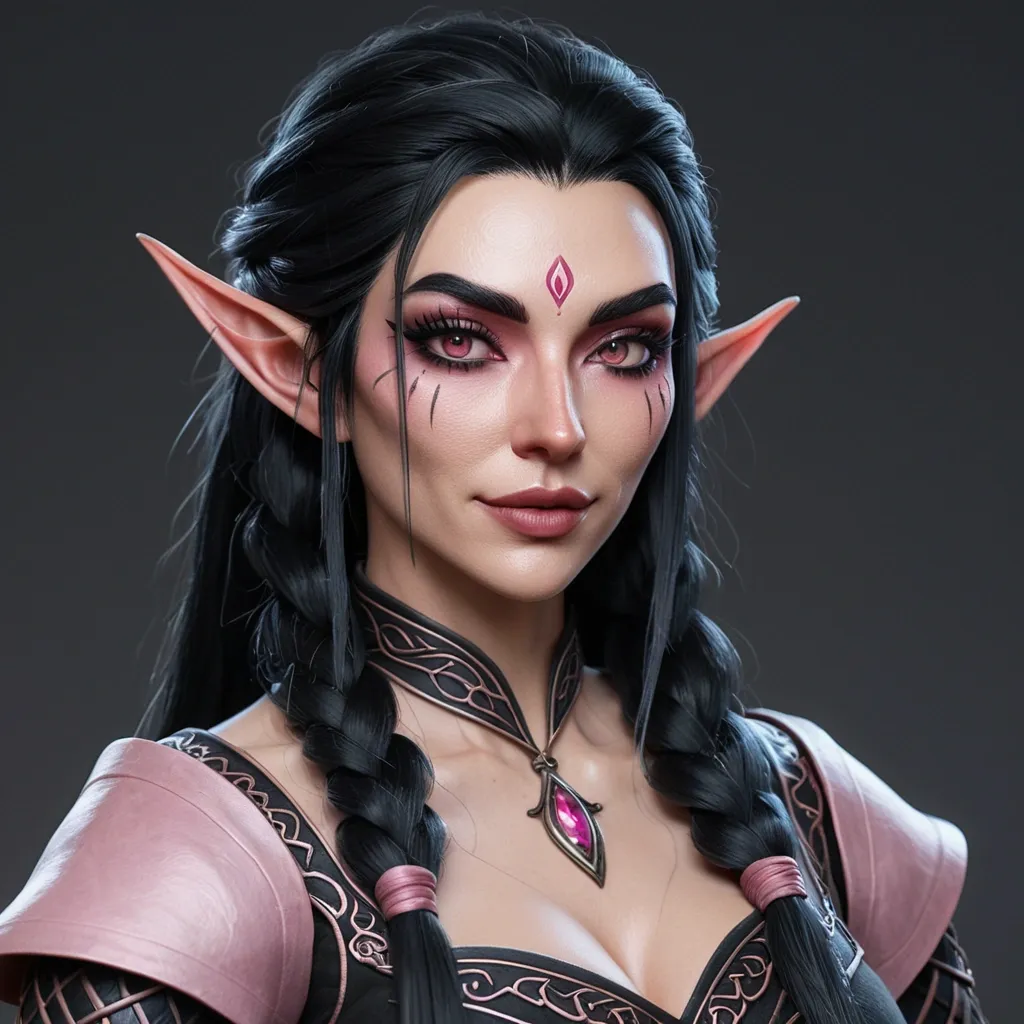 Generate a dungeons and dragons character portrait of the face of a femme nonbinary half eladrin elf half human with a delicate appearance. She is a thief and warlock. Her hair is a rose-quartz pink with black streaks and she has a few tiny braids in her otherwise very long and otherwise unadorned silky hair. she has bright black eyes and a little bit of an east asian look to her features and clothing , a sly and mischievous smile , with thick arched brows , gleaming clever and naughty eyes , heart shaped face. ,