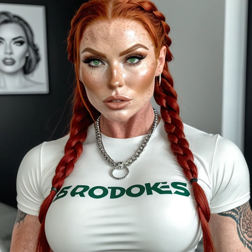 Generate Gorgeous female boss , bimbo , hourglass body , abnormally massive female bodybuilder , gorgeous , close up , full lips , big booty , redheaded , freckles on face and breast , braided design hair , feminine silhouette , too big breast , big booty , sexy thighs abs , silhouette , up close , flexing biceps , beautiful green eyes , legs are iconic and defining physical feature , both visually and in terms of combat ability.wearing an outfit that is a striking blend of elegance , power , and femininity , designed to command attention in any room. The suit is tailored to perfection , hugging the wearer’s curves with precision while emphasizing a structured silhouette. The fabric itself is a refined grey tweed patterned with subtle white grid lines , giving the suit a texture that feels both sophisticated and modern. The blazer features broad blue lapels and gold button accents , adding a luxurious touch that elevates the look beyond typical business attire. The matching high-waisted trousers elongate the frame , further enhancing the poised and commanding effect of the ensemble.The styling choices amplify the boldness of the suit. The inner blouse is a silky , greybutton-down shirt that complements the tweed’s tone while introducing a softer , feminine balance to the sharp tailoring of the jacket. The blouse peeks out neatly from under the blazer , maintaining elegance without drawing focus away from the suit’s commanding cut. Accessories are kept minimal yet intentional: a delicate layered gold necklace and hoop earrings that add glimmers of light and luxury without overpowering the outfit. The choice of voluminous , honey-brown braids cascading down her shoulders frames the face with both confidence and glamour , completing the commanding visual.Altogether , this look communicates a blend of authority and allure. It is business-ready yet fashion-forward , balancing corporate structure with vibrant femininity. The color palette blue , grey and gold avoids being overly delicate , instead embracing the richness of texture , structure , and presence. This is the kind of ensemble that speaks to ambition , sophistication , and personal style—ideal for someone who thrives in positions of influence but insists on expressing her individuality with bold elegance. It’s not just clothing—it’s a statement of power wrapped in grace. In luxury living legs that could crush a watermelon , skirt high boots are a bold and striking statement piece , crafted in glossy black patent leather that gives them a sleek , polished finish. Rising to just below the knee , the boots feature three adjustable buckle straps along the shaft , adding both edge and detail to their design. The towering stiletto heel , paired with a thick platform sole , creates an ultra-dramatic silhouette that elongates the leg and exudes power and confidence. With their combination of shine , height , and structure , these boots perfectly balance fierce femininity with high-fashion allure. Freckles gorgeous green eyes , eggshell white swede t-shirt and silver necklace , black leather pants ,
