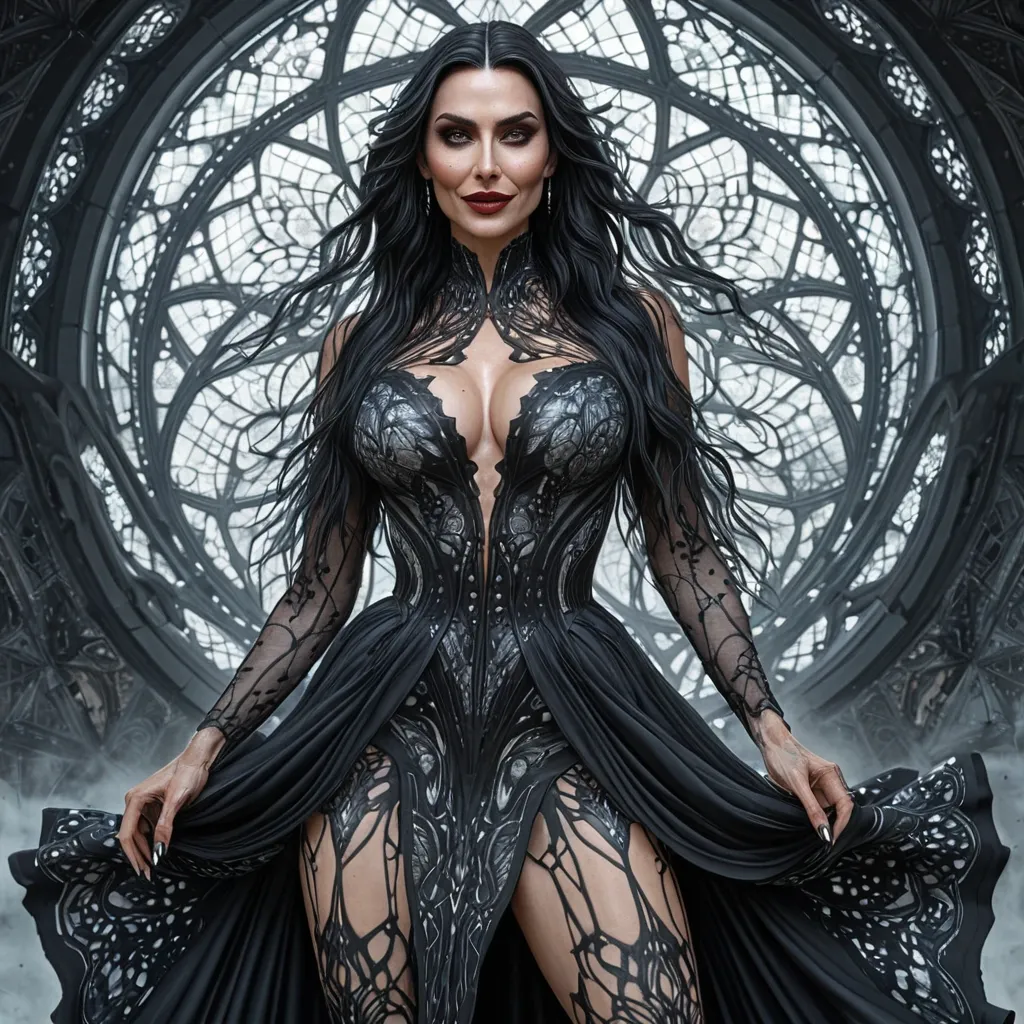 full body , smart smiling female vamp wearing half body (fine black patterned chiffon dress:2.0) , (insanely detailed , bloom:1.5) , (highest quality , Greg Rutkowski , concept art , 4k) , (analog:1.2) , (high sharpness) , (detailed pupils:1.1) , (painting:1.1) , (digital painting:1.1) , detailed face and eyes , Masterpiece , best quality , (highly detailed photo:1.1) , 8k , photorealistic , (long open hair blurring into epic background scene , ecstatic:2.0) , (young woman:1.1) , art by Luis Royo , extra realistic , (perfect body:4.0) , realistic , real shadow , 3d , (background: epic scene of an spaceship falling from sky , tempting , outerspace , high quality , voronoi pattern , big pecs , art by Jenny Saville) ,