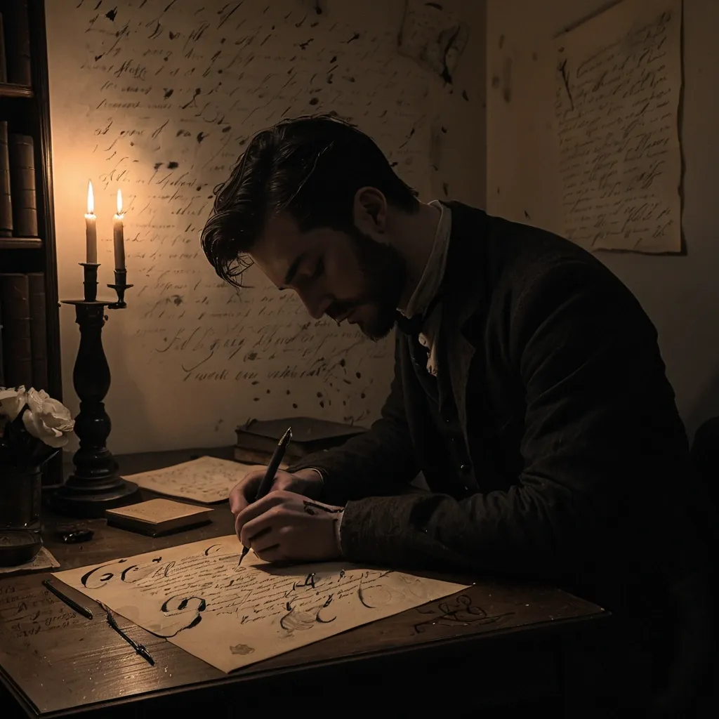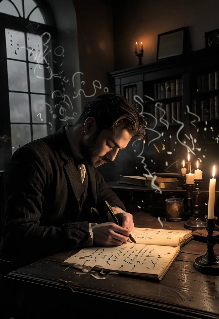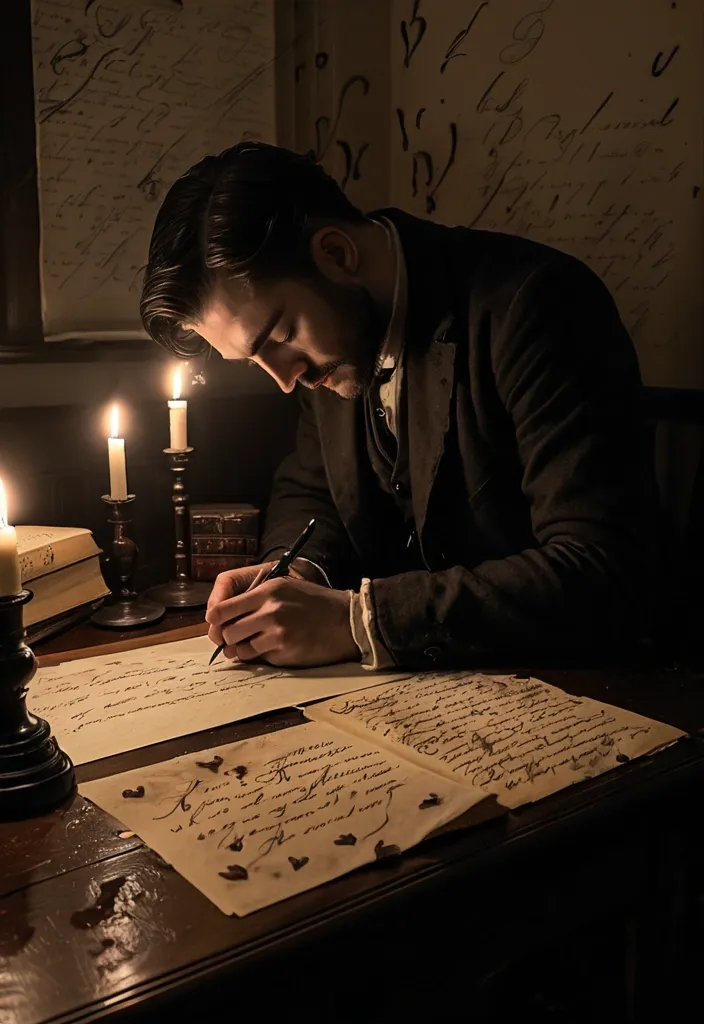 Página 3: 1912 - Sozinho (Aidan) Panorâmico: Escritório Aidan. Escrivaninha madeira escura , livros antigos , vela acesa (luz tremula) , atmosfera íntima. Detalhes: Mão Aidan (escrevendo carta , tinta preta escorrendo , efeito de fumaça saindo da pena) , carta (palavras apaixonadas , corações/flores desenhados , brilho suave ao redor) , lágrima (caindo , manchando tinta , efeito de ondulação na carta). ,