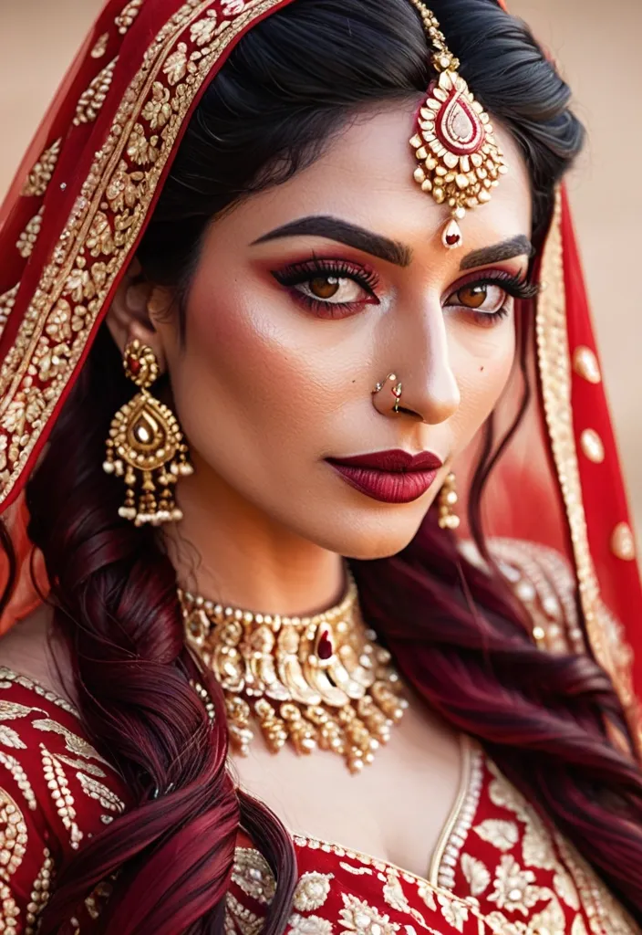 A hyper-realistic portrait of the young woman from the uploaded image (Google Gemini refinement) , captured in a close-up at a tilted 45-degree angle , with waist-length very long brown voluminous hair flowing freely , a few thin soft strands drifting across her face to highlight her long curled eyelashes , her lips in a gentle deep red shade giving a dreamy sweetness She is wearing a full traditional Rajasthani poshak — a vibrant color lehenga with intricate gold gota-patti work , ,