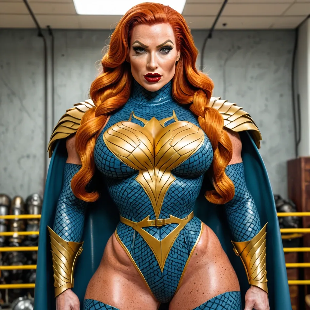 Generate Gorgeous female boss , bimbo , hourglass body , abnormally massive female bodybuilder , gorgeous , close up , full lips , big booty , redheaded , freckles on face and breast , braided design hair , feminine silhouette , too big breast , big booty , sexy thighs abs , silhouette , up close , flexing biceps , beautiful green eyes , legs are iconic and defining physical feature , both visually and in terms of combat ability.wearing an outfit that is a striking blend of elegance , power , and femininity , designed to command attention in any room. The suit is tailored to perfection , hugging the wearer’s curves with precision while emphasizing a structured silhouette. The fabric itself is a refined grey tweed patterned with subtle white grid lines , giving the suit a texture that feels both sophisticated and modern. The blazer features broad blue lapels and gold button accents , adding a luxurious touch that elevates the look beyond typical business attire. The matching high-waisted trousers elongate the frame , further enhancing the poised and commanding effect of the ensemble.The styling choices amplify the boldness of the suit. The inner blouse is a silky , greybutton-down shirt that complements the tweed’s tone while introducing a softer , feminine balance to the sharp tailoring of the jacket. The blouse peeks out neatly from under the blazer , maintaining elegance without drawing focus away from the suit’s commanding cut. Accessories are kept minimal yet intentional: a delicate layered gold necklace and hoop earrings that add glimmers of light and luxury without overpowering the outfit. The choice of voluminous , honey-brown braids cascading down her shoulders frames the face with both confidence and glamour , completing the commanding visual.Altogether , this look communicates a blend of authority and allure. It is business-ready yet fashion-forward , balancing corporate structure with vibrant femininity. The color palette blue , grey and gold avoids being overly delicate , instead embracing the richness of texture , structure , and presence. This is the kind of ensemble that speaks to ambition , sophistication , and personal style—ideal for someone who thrives in positions of influence but insists on expressing her individuality with bold elegance. It’s not just clothing—it’s a statement of power wrapped in grace. In luxury living legs that could crush a watermelon , skirt high boots are a bold and striking statement piece , crafted in glossy black patent leather that gives them a sleek , polished finish. Rising to just below the knee , the boots feature three adjustable buckle straps along the shaft , adding both edge and detail to their design. The towering stiletto heel , paired with a thick platform sole , creates an ultra-dramatic silhouette that elongates the leg and exudes power and confidence. With their combination of shine , height , and structure , these boots perfectly balance fierce femininity with high-fashion allure.The woman in the image wears a striking 1940s-inspired superhero outfit that exudes strength and elegance. Her form-fitting bodysuit is a deep , muted teal-gray with a subtle textured finish , hugging her curves while allowing for mobility. A dramatic high-collared cape in matching fabric drapes over her shoulders , adding a regal silhouette. At the center of her chest is a prominent golden eagle emblem with outstretched wings , symbolizing power and patriotism typical of the Golden Age of comics. Golden armored gauntlets cover her forearms and hands , intricately detailed with feather-like patterns that echo the eagle motif , while a wide golden belt with a V-shaped buckle cinches her waist , accentuating her confident stance with hands on hips. Her vibrant red hair is styled in soft victory rolls , complementing the vintage aesthetic , and she completes the look with dangling gold earrings and bold red lipstick , blending classic femininity with heroic authority. The overall design evokes the bold , iconic style of 1940s comic book heroe golden eagle on chest , grayish blue leather patterned bodysuit , gold cape , gold high boots ,