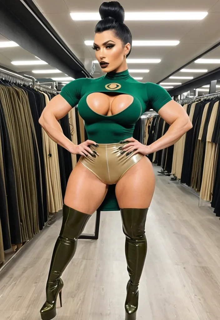 24 years old , Caucasian , Generate Gorgeous female boss , bimbo , hourglass body , abnormally massive female bodybuilder , gorgeous , close up , full lips , big boot , hair in bun , black hair , short hair 1940s/futuristic feminine silhouette , too big breast , big booty , sexy thighs abs , silhouette , up close , flexing biceps , gorgeous brown eyes , legs are iconic and defining physical feature , both visually and in terms of combat ability.wearing an outfit that is a striking blend of elegance , power , and femininity , designed to command attention in any room. The suit is tailored to perfection , hugging the wearer’s curves with precision while emphasizing a structured silhouette. The fabric itself is a refined grey tweed patterned with subtle white grid lines , giving the suit a texture that feels both sophisticated and modern. The blazer features broad blue lapels and gold button accents , adding a luxurious touch that elevates the look beyond typical business attire. The matching high-waisted trousers elongate the frame , further enhancing the poised and commanding effect of the ensemble.The styling choices amplify the boldness of the suit. The inner blouse is a silky , greybutton-down shirt that complements the tweed’s tone while introducing a softer , feminine balance to the sharp tailoring of the jacket. The blouse peeks out neatly from under the blazer , maintaining elegance without drawing focus away from the suit’s commanding cut. Accessories are kept minimal yet intentional: a delicate layered gold necklace and hoop earrings that add glimmers of light and luxury without overpowering the outfit. The choice of voluminous , honey-brown braids cascading down her shoulders frames the face with both confidence and glamour , completing the commanding visual.Altogether , this look communicates a blend of authority and allure. It is business-ready yet fashion-forward , balancing corporate structure with vibrant femininity. The color palette blue , grey and gold avoids being overly delicate , instead embracing the richness of texture , structure , and presence. This is the kind of ensemble that speaks to ambition , sophistication , and personal style—ideal for someone who thrives in positions of influence but insists on expressing her individuality with bold elegance. It’s not just clothing—it’s a statement of power wrapped in grace. In luxury living legs that could crush a watermelon , skirt high boots are a bold and striking statement piece , crafted in glossy black patent leather that gives them a sleek , polished finish. Rising to just below the knee , the boots feature three adjustable buckle straps along the shaft , adding both edge and detail to their design. The towering stiletto heel , paired with a thick platform sole , creates an ultra-dramatic silhouette that elongates the leg and exudes power and confidence. With their combination of shine , height , and structure , these boots perfectly balance fierce femininity with high-fashion allure. High cheekbones , prominent jawline , gorgeous big light reflecting brown eyes , green , beige and gold , futuristic t-shirt , and long beige skirt , stockings and high heel boots , enormous breast , enormous butt , toned legs ,