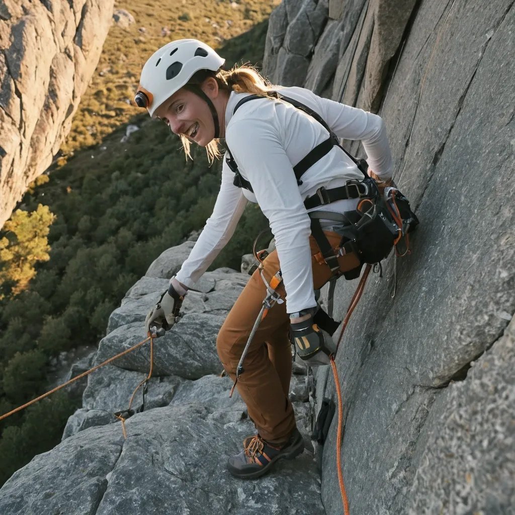 filming from Dutch angle tracking shot , bottom to over Views , 35mmfilm , Rock climbing harness displayed being put on a rock climber hanging from a steep rock wall at golden hour. Dynamic pose , wearing a wearing a white safety helmet , protective gloves , a fitted long-sleeve work shirt , heavy-duty work pants , and a full climbing harness with visible safety gear and carabiner. she's climbing on a rocky-mountain , sweaty , kind of powered out , but happy and with an expactand look. Camera perspective 40 feet away from behind. ,