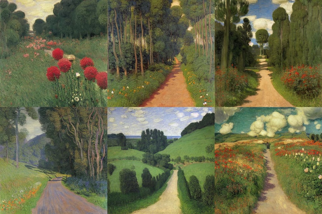 The oracle of waters by Ross Tran and Claude Monet , oil on canvas. The road to valhalla , art by Claude Monet , art by Tommaso Masaccio , Flowers and Lush Vegetation , art by Jan Van Eyck , art by Andrea Mantegna , art by Rembrandt Van Rijn , art by Claude Monet , art by Winslow Homer , art by Andy Warhol , art by Caspar David Friedrich , vector illustration , art by Johannes Vermeer , art by Edward Hopper ,
