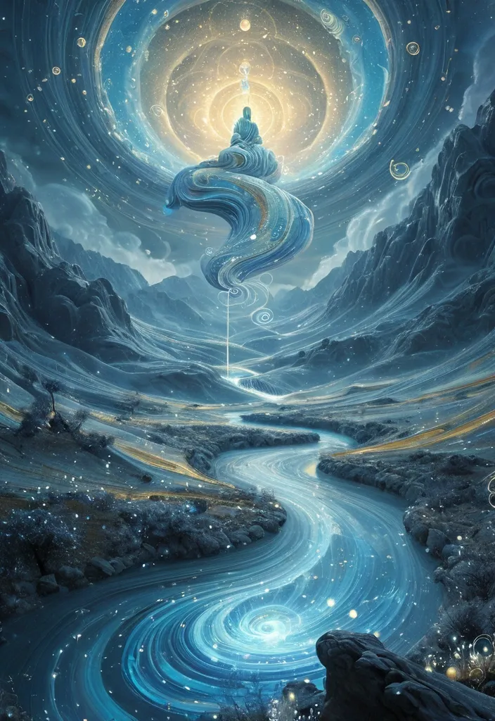 abstract vector fractal , a lonely a person who rides waves on a surfboard , motion to down made of water splashing , on a inversion of water drops , wave function , Zentangle , 3d shading , swirls , curves , the ocean , surreal. Style: deeply spiritual sci-fi art , reminiscent of digital hyperrealism combined with cosmic impressionism. Focus on intricate detail of light and energetic flow. ,