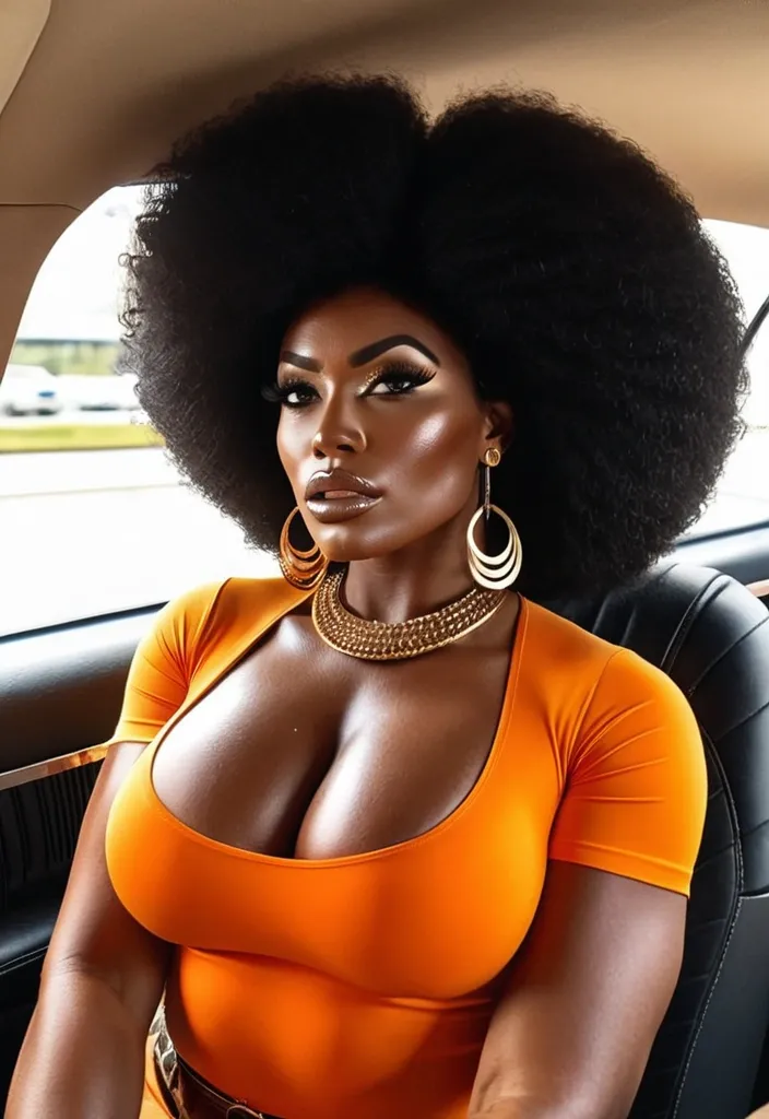 Generate Gorgeous 24 years old , 1970s female boss , dark-skinned African-American woman , pointy face , bimbo , hourglass body , abnormally massive female bodybuilder , gorgeous , close up , full lips , big booty , 1970s Afro stylish , hoop earrings feminine silhouette , too big breast , big booty , sexy thighs abs , silhouette , up close , flexing biceps , beautiful brown eyes , legs are iconic and defining physical feature , both visually and in terms of combat ability.wearing an outfit that is a striking blend of elegance , power , and femininity , designed to command attention in any room. The suit is tailored to perfection , hugging the wearer’s curves with precision while emphasizing a structured silhouette. The fabric itself is a refined grey tweed patterned with subtle white grid lines , giving the suit a texture that feels both sophisticated and modern. The blazer features broad blue lapels and gold button accents , adding a luxurious touch that elevates the look beyond typical business attire. The matching high-waisted trousers elongate the frame , further enhancing the poised and commanding effect of the ensemble.The styling choices amplify the boldness of the suit. The inner blouse is a silky , greybutton-down shirt that complements the tweed’s tone while introducing a softer , feminine balance to the sharp tailoring of the jacket. The blouse peeks out neatly from under the blazer , maintaining elegance without drawing focus away from the suit’s commanding cut. Accessories are kept minimal yet intentional: a delicate layered gold necklace and hoop earrings that add glimmers of light and luxury without overpowering the outfit. The choice of voluminous , honey-brown braids cascading down her shoulders frames the face with both confidence and glamour , completing the commanding visual.Altogether , this look communicates a blend of authority and allure. It is business-ready yet fashion-forward , balancing corporate structure with vibrant femininity. The color palette blue , grey and gold avoids being overly delicate , instead embracing the richness of texture , structure , and presence. This is the kind of ensemble that speaks to ambition , sophistication , and personal style—ideal for someone who thrives in positions of influence but insists on expressing her individuality with bold elegance. It’s not just clothing—it’s a statement of power wrapped in grace. In luxury living legs that could crush a watermelon , skirt high boots are a bold and striking statement piece , crafted in glossy black patent leather that gives them a sleek , polished finish. Rising to just below the knee , the boots feature three adjustable buckle straps along the shaft , adding both edge and detail to their design. The towering stiletto heel , paired with a thick platform sole , creates an ultra-dramatic silhouette that elongates the leg and exudes power and confidence. With their combination of shine , height , and structure , these boots perfectly balance fierce femininity with high-fashion allure. High cheekbones , prominent jawline , gorgeous big brown light hazel honey , , enormous breast , orange velvet t-shirt , gold futuristic necklace , grey designer skirt sitting in car , enormous breast , enormous butt , massive cleavage ,