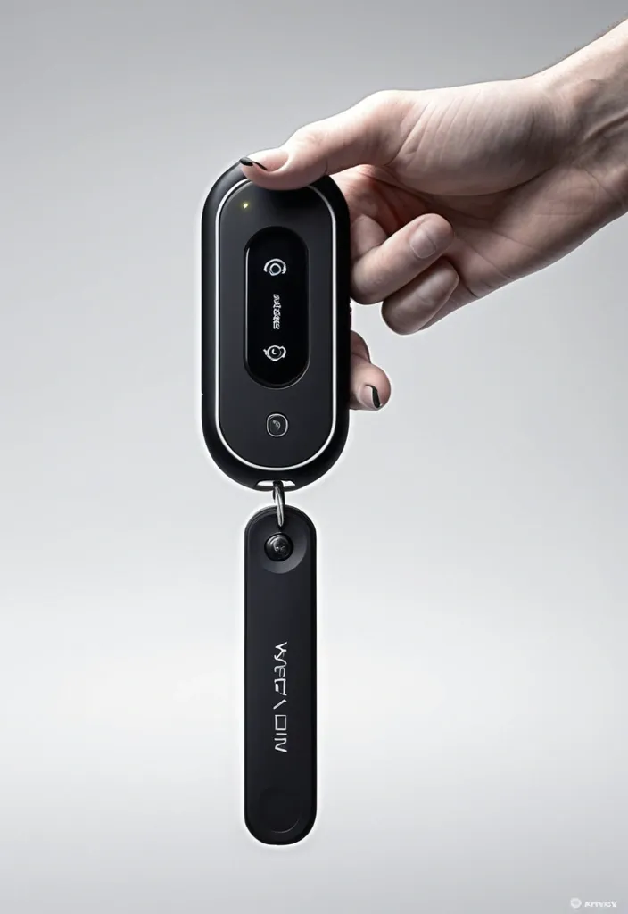 “Genera varias imágenes conceptuales de un dispositivo llamado KeyAI , un asistente de inteligencia artificial portátil del tamaño de una llave de coche. El dispositivo debe tener un diseño moderno , minimalista y tecnológico. Debe verse como un llavero inteligente , con una carcasa pequeña y ergonómica , un botón principal grande en la parte frontal y una mini cámara integrada en la parte superior o lateral. El tamaño total debe ser similar a un mando de coche , compacto y fácil de llevar en la mano. Incluye diferentes ángulos: vista frontal , lateral , trasera y en perspectiva. En algunas imágenes muéstralo sujeto por una mano humana para transmitir escala real. En otras imágenes muéstralo colgado en un llavero junto a unas llaves normales. El concepto debe transmitir que el dispositivo puede: escuchar voz , hablar mediante un pequeño altavoz , analizar lo que ve con su cámara , funcionar sin un móvil y ser extremadamente portátil. Añade pequeños detalles visuales como un LED indicador , micrófonos discretos y un puerto USB-C en la parte inferior. La iluminación debe ser clara y limpia , estilo fotografía de producto profesional , con fondo blanco o negro según la imagen. Calidad muy alta , estilo realista , 8K , prototipo industrial futurista.” ,