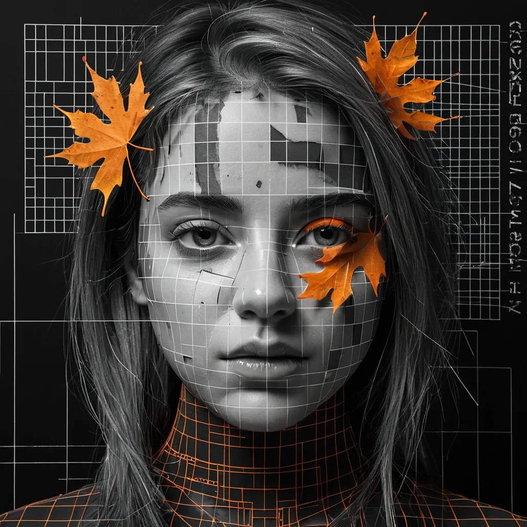 The create a ultra pro hyper-realistic a high-contrast black and white cinematic portrait. A close-up face (realistic photo using the provided input image as identity reference) split vertically in half. The right side shows a realistic human face with dramatic lighting , sharp details , and deep shadows. The image is a deconstructed multimedia collage: his face is overlaid with faint , intricate architectural blueprints , geometric grid lines , and technical schematics. The composition features an explosive , splattered edge effect with charcoal and white paint strokes. Scattered hyper-realistic orange autumn maple leaves drift around her neck and hair. The left side is mostly gray stylish with bold vertical typography spelling "RAJU". The stylish text should be large , modern , and slightly textured , blending subtly with the face. High-contrast lighting , 8k resolution , ultra-sharp focus on the eyes , featuring hyper-realistic skin textures , muted earth-tone color palette with pops of vibrant orange , editorial photography style. ,
