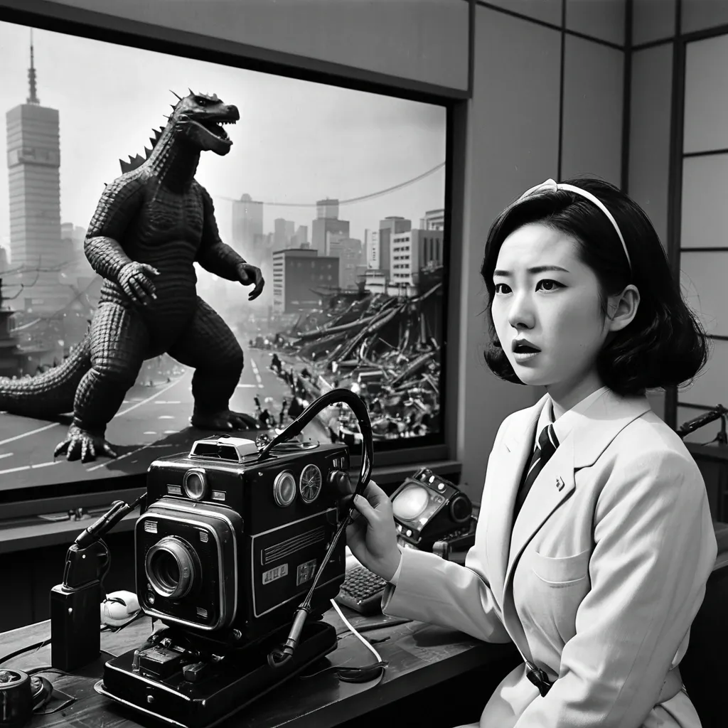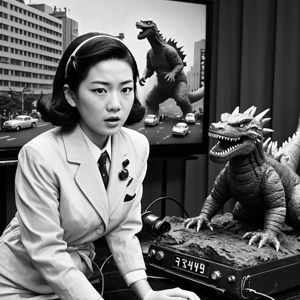 full lenght , a beautiful european female with wavy brown shoulder hair in her mid twenty in blue and white turtleneck sleeveless zipper spandex MINI spacedress , she's walking discretly in a dark and creepy space station with japanese influence , she have a little laser gun in right hand , a creepy alien monster with tentacles is looking at her in the back , some computer and screen , science fiction horror cinematic style ,