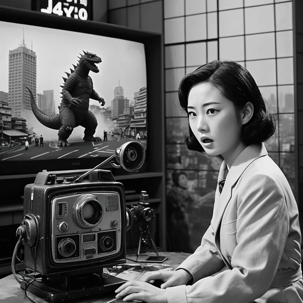 Beautiful Japanese girl in 1980s Japan , long dark hair with purple highlights , wearing oversized denim jacket over black dress/top , black mini skirt , dark stockings/tights , black lace-up boots , silver hoop earrings , cross necklace , standing pose in a vintage 1980s Japanese coffee shop/café with retro interior , warm ambient lighting. Vintage film photography aesthetic with heavy film grain , light leaks , analog camera imperfections , scratches and dust on film , faded colors , nostalgic 80s Kodak film look , slight overexposure , authentic Japanese 1980s fashion and styling ,