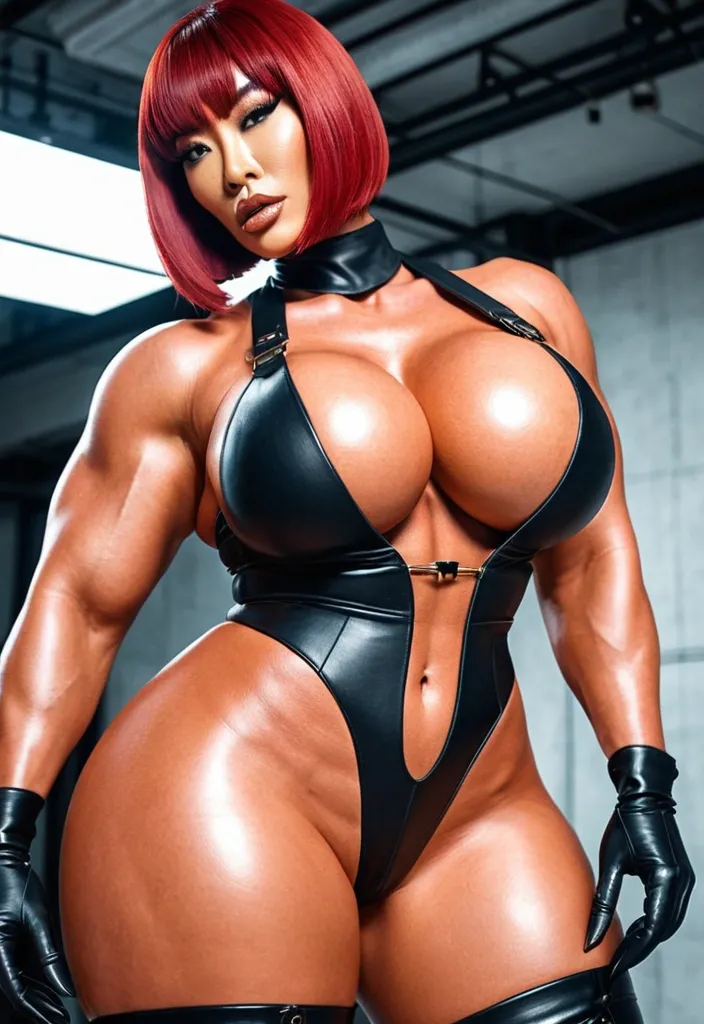 Generate Gorgeous female boss , bimbo , Japanese woman , , hourglass body , abnormally massive female bodybuilder , gorgeous , close up , full lips , big booty , red hair , bob-cut , short hair , feminine silhouette , too big breast , big booty , sexy thighs abs , silhouette , up close , flexing biceps , beautiful brown eyes , legs are iconic and defining physical feature , both visually and in terms of combat ability.wearing an outfit that is a striking blend of elegance , power , and femininity , designed to command attention in any room. The suit is tailored to perfection , hugging the wearer’s curves with precision while emphasizing a structured silhouette. The fabric itself is a refined grey tweed patterned with subtle white grid lines , giving the suit a texture that feels both sophisticated and modern. The blazer features broad blue lapels and gold button accents , adding a luxurious touch that elevates the look beyond typical business attire. The matching high-waisted trousers elongate the frame , further enhancing the poised and commanding effect of the ensemble.The styling choices amplify the boldness of the suit. The inner blouse is a silky , greybutton-down shirt that complements the tweed’s tone while introducing a softer , feminine balance to the sharp tailoring of the jacket. The blouse peeks out neatly from under the blazer , maintaining elegance without drawing focus away from the suit’s commanding cut. Accessories are kept minimal yet intentional: a delicate layered gold necklace and hoop earrings that add glimmers of light and luxury without overpowering the outfit. The choice of voluminous , honey-brown braids cascading down her shoulders frames the face with both confidence and glamour , completing the commanding visual.Altogether , this look communicates a blend of authority and allure. It is business-ready yet fashion-forward , balancing corporate structure with vibrant femininity. The color palette blue , grey and gold avoids being overly delicate , instead embracing the richness of texture , structure , and presence. This is the kind of ensemble that speaks to ambition , sophistication , and personal style—ideal for someone who thrives in positions of influence but insists on expressing her individuality with bold elegance. It’s not just clothing—it’s a statement of power wrapped in grace. In luxury living legs that could crush a watermelon , skirt high boots are a bold and striking statement piece , crafted in glossy black patent leather that gives them a sleek , polished finish. Rising to just below the knee , the boots feature three adjustable buckle straps along the shaft , adding both edge and detail to their design. The towering stiletto heel , paired with a thick platform sole , creates an ultra-dramatic silhouette that elongates the leg and exudes power and confidence. With their combination of shine , height , and structure , these boots perfectly balance fierce femininity with high-fashion allure. High cheekbones , prominent jawline , gorgeous big enormous breast , enormous butt , up close massive cleavage , The mix of leather , fur , jewelry , and structured straps signals confidence , control , and presentation.•Every element is meant to be seen; nothing about the outfit suggests movement or utility.In plain terms:She’s dressed in a carefully constructed , high-impact outfit that blends luxury textures and exposed structure , designed to project presence and visual authority rather than comfort or everyday use. Enormous breast , enormous butt ,