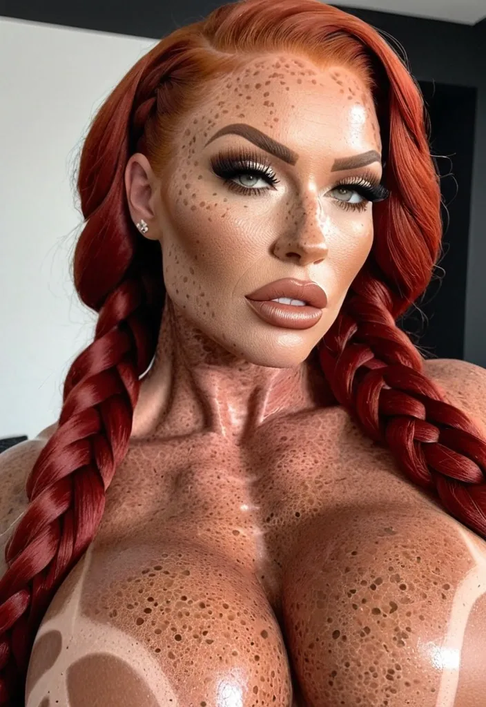 Generate Gorgeous female boss , bimbo , hourglass body , abnormally massive female bodybuilder , gorgeous , close up , full lips , big booty , redheaded , freckles on face and breast , braided design hair , feminine silhouette , too big breast , big booty , sexy thighs abs , silhouette , up close , flexing biceps , beautiful green eyes , legs are iconic and defining physical feature , both visually and in terms of combat ability.wearing an outfit that is a striking blend of elegance , power , and femininity , designed to command attention in any room. The suit is tailored to perfection , hugging the wearer’s curves with precision while emphasizing a structured silhouette. The fabric itself is a refined grey tweed patterned with subtle white grid lines , giving the suit a texture that feels both sophisticated and modern. The blazer features broad blue lapels and gold button accents , adding a luxurious touch that elevates the look beyond typical business attire. The matching high-waisted trousers elongate the frame , further enhancing the poised and commanding effect of the ensemble.The styling choices amplify the boldness of the suit. The inner blouse is a silky , greybutton-down shirt that complements the tweed’s tone while introducing a softer , feminine balance to the sharp tailoring of the jacket. The blouse peeks out neatly from under the blazer , maintaining elegance without drawing focus away from the suit’s commanding cut. Accessories are kept minimal yet intentional: a delicate layered gold necklace and hoop earrings that add glimmers of light and luxury without overpowering the outfit. The choice of voluminous , honey-brown braids cascading down her shoulders frames the face with both confidence and glamour , completing the commanding visual.Altogether , this look communicates a blend of authority and allure. It is business-ready yet fashion-forward , balancing corporate structure with vibrant femininity. The color palette blue , grey and gold avoids being overly delicate , instead embracing the richness of texture , structure , and presence. This is the kind of ensemble that speaks to ambition , sophistication , and personal style—ideal for someone who thrives in positions of influence but insists on expressing her individuality with bold elegance. It’s not just clothing—it’s a statement of power wrapped in grace. In luxury living legs that could crush a watermelon , skirt high boots are a bold and striking statement piece , crafted in glossy black patent leather that gives them a sleek , polished finish. Rising to just below the knee , the boots feature three adjustable buckle straps along the shaft , adding both edge and detail to their design. The towering stiletto heel , paired with a thick platform sole , creates an ultra-dramatic silhouette that elongates the leg and exudes power and confidence. With their combination of shine , height , and structure , these boots perfectly balance fierce femininity with high-fashion allure. ,