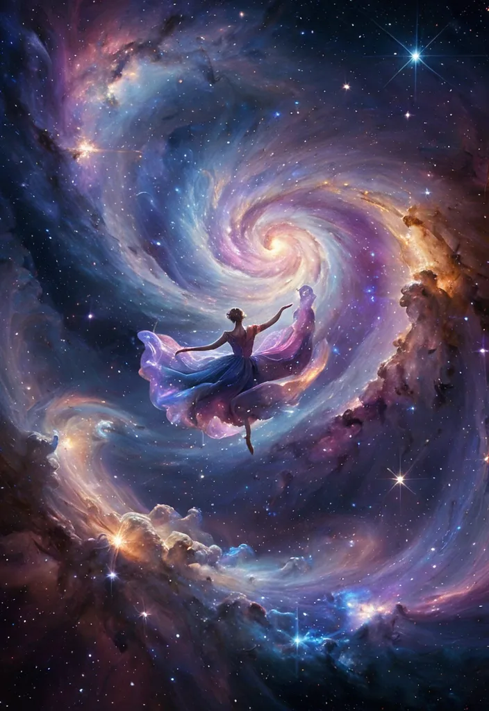 A breathtaking masterpiece depicting a celestial ballet of nebulae and star clusters forming impossible , dreamlike figures in the vast expanse of space. Swirls of vibrant cosmic dust intertwine with distant galaxies , creating a symphony of light and color. The style is a fusion of ethereal fantasy art and highly detailed digital painting , reminiscent of the works of artists like Thomas Kinkade and Albert Bierstadt , with an 8k resolution and cinematic composition. ,