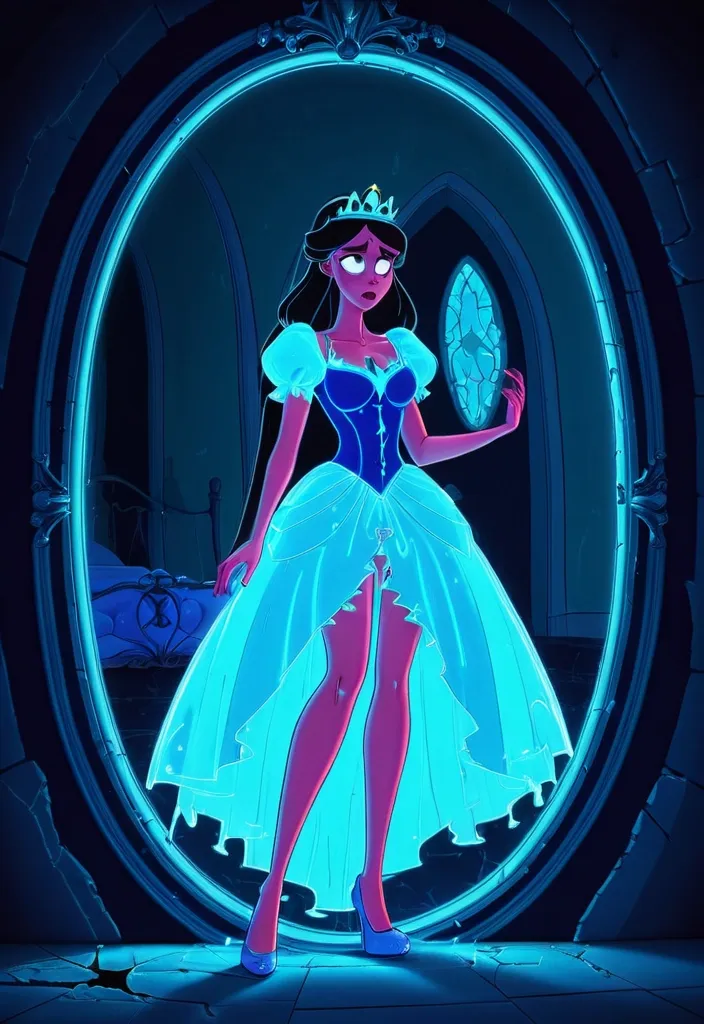 A magical fairytale style image of Alice , walking down a black and white harlequin checkered pathway in a magical neon Wonderland. Different types of flowers glow vibrantly in all colours of the rainbow along the path that leads to a magical Disney style castle in the distance. Coloured fairy lights hang from the trees , and the castle glows a brilliant shade of purple and blue. Fireworks fill the night sky , shimmering down on the castle below. highly-detailed , fantasy , whimsical , vivid colours , glowing , neon ,