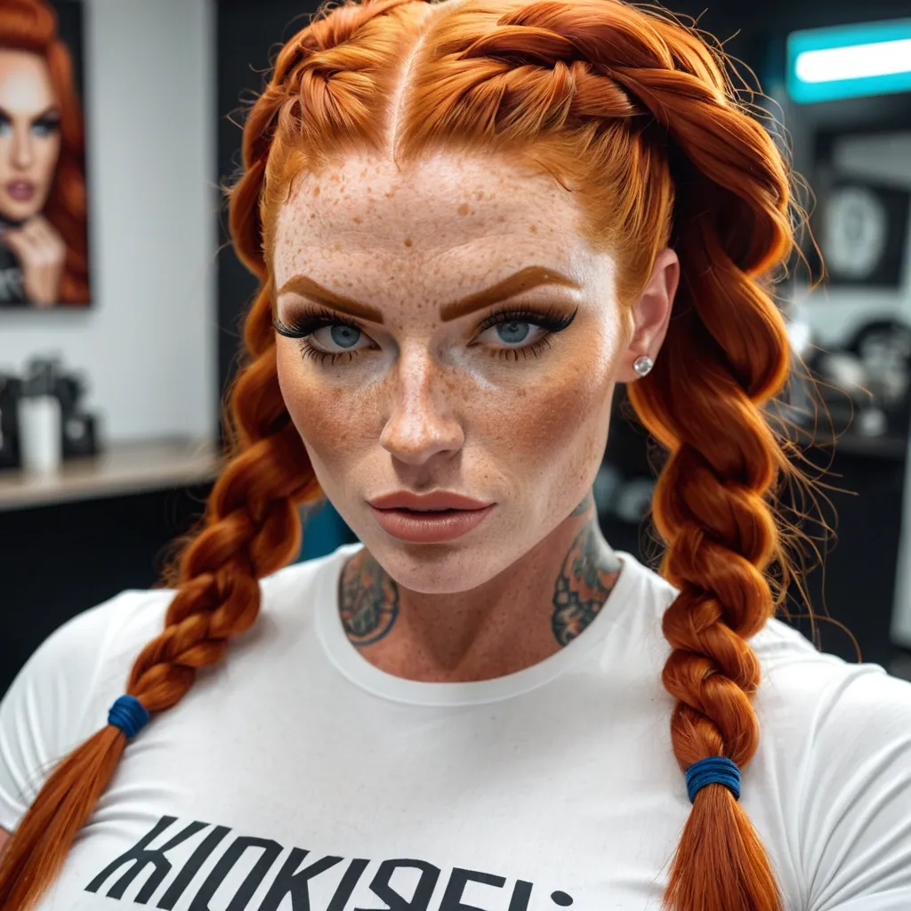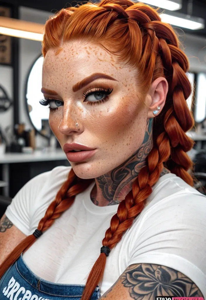 Generate Gorgeous female boss , bimbo , hourglass body , abnormally massive female bodybuilder , gorgeous , close up , full lips , big booty , redheaded , freckles on face and breast , braided design hair , feminine silhouette , too big breast , big booty , sexy thighs abs , silhouette , up close , flexing biceps , beautiful green eyes , legs are iconic and defining physical feature , both visually and in terms of combat ability.wearing an outfit that is a striking blend of elegance , power , and femininity , designed to command attention in any room. The suit is tailored to perfection , hugging the wearer’s curves with precision while emphasizing a structured silhouette. The fabric itself is a refined grey tweed patterned with subtle white grid lines , giving the suit a texture that feels both sophisticated and modern. The blazer features broad blue lapels and gold button accents , adding a luxurious touch that elevates the look beyond typical business attire. The matching high-waisted trousers elongate the frame , further enhancing the poised and commanding effect of the ensemble.The styling choices amplify the boldness of the suit. The inner blouse is a silky , greybutton-down shirt that complements the tweed’s tone while introducing a softer , feminine balance to the sharp tailoring of the jacket. The blouse peeks out neatly from under the blazer , maintaining elegance without drawing focus away from the suit’s commanding cut. Accessories are kept minimal yet intentional: a delicate layered gold necklace and hoop earrings that add glimmers of light and luxury without overpowering the outfit. The choice of voluminous , honey-brown braids cascading down her shoulders frames the face with both confidence and glamour , completing the commanding visual.Altogether , this look communicates a blend of authority and allure. It is business-ready yet fashion-forward , balancing corporate structure with vibrant femininity. The color palette blue , grey and gold avoids being overly delicate , instead embracing the richness of texture , structure , and presence. This is the kind of ensemble that speaks to ambition , sophistication , and personal style—ideal for someone who thrives in positions of influence but insists on expressing her individuality with bold elegance. It’s not just clothing—it’s a statement of power wrapped in grace. In luxury living legs that could crush a watermelon , skirt high boots are a bold and striking statement piece , crafted in glossy black patent leather that gives them a sleek , polished finish. Rising to just below the knee , the boots feature three adjustable buckle straps along the shaft , adding both edge and detail to their design. The towering stiletto heel , paired with a thick platform sole , creates an ultra-dramatic silhouette that elongates the leg and exudes power and confidence. With their combination of shine , height , and structure , these boots perfectly balance fierce femininity with high-fashion allure , white t-shirt , and blue jean shorts in barbershop , freckles , ginger hair , intense eyes , ,