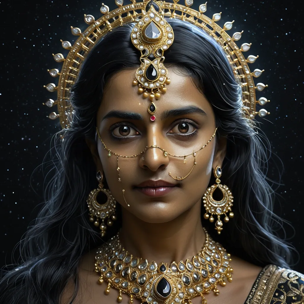 Hyperrealistic portrait of a breathtakingly beautiful South Indian woman in her 48s , long black hair , deep expressive dark eyes , serene and divine expression , ultra-detailed mature facial features , adorned with diamond-studded traditional Indian golden jewelry - diamond maang tikka melting slightly into stardust , crescent moon-shaped jhumkas bending with gravity-defying elegance , surreal Salvador Dalí-style , black background hyperrealistic , sharp clarity on diamonds , cinematic backlight , mythological elegance , fantasy surrealism ,
