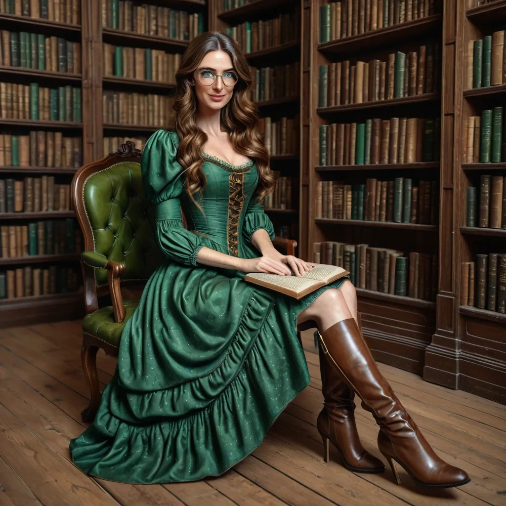Photorealistic , realistic face , full lenght freckled brown wavy shoulder hair 30yo beautiful woman wearing a green and bronze victorian long dress , brown long boots. blue eyes and a shy smile , glasses. the scene is in a wooden library she's sitting on a chair and looking at an old book in her hands ,
