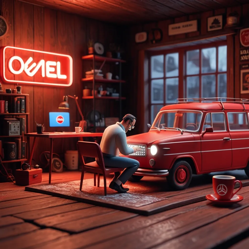 A cozy miniature 3D scene featuring a stylized figure of a man with glasses working on a laptop with an DELL logo , sitting beside a red and white vintage Mercedes van indoors. Warm lighting , wooden floor and furniture , a cup of coffee on a small table , bookshelf in the background , soft shadows , detailed textures. Neon sign 'Dan Ciufu' glowing in the background. High-quality , cinematic , toy-like aesthetic ,