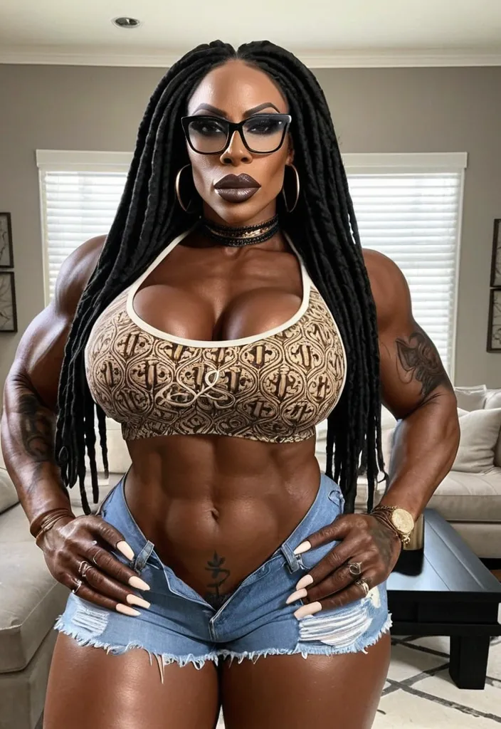 Generate Gorgeous female boss , bimbo , eye glasses , 42 years old , very dark-skinned African-American woman , very big lips , hourglass body , abnormally massive female bodybuilder , gorgeous , close up , full lips , big booty , dreadlocks , feminine silhouette , too big breast , big booty , sexy thighs abs , silhouette , up close , flexing biceps , big gorgeous hazel eyes , legs are iconic and defining physical feature , both visually and in terms of combat ability.wearing an outfit that is a striking blend of elegance , power , and femininity , designed to command attention in any room. The suit is tailored to perfection , hugging the wearer’s curves with precision while emphasizing a structured silhouette. The fabric itself is a refined grey tweed patterned with subtle white grid lines , giving the suit a texture that feels both sophisticated and modern. The blazer features broad blue lapels and gold button accents , adding a luxurious touch that elevates the look beyond typical business attire. The matching high-waisted trousers elongate the frame , further enhancing the poised and commanding effect of the ensemble.The styling choices amplify the boldness of the suit. The inner blouse is a silky , greybutton-down shirt that complements the tweed’s tone while introducing a softer , feminine balance to the sharp tailoring of the jacket. The blouse peeks out neatly from under the blazer , maintaining elegance without drawing focus away from the suit’s commanding cut. Accessories are kept minimal yet intentional: a delicate layered gold necklace and hoop earrings that add glimmers of light and luxury without overpowering the outfit. The choice of voluminous , honey-brown braids cascading down her shoulders frames the face with both confidence and glamour , completing the commanding visual.Altogether , this look communicates a blend of authority and allure. It is business-ready yet fashion-forward , balancing corporate structure with vibrant femininity. The color palette blue , grey and gold avoids being overly delicate , instead embracing the richness of texture , structure , and presence. This is the kind of ensemble that speaks to ambition , sophistication , and personal style—ideal for someone who thrives in positions of influence but insists on expressing her individuality with bold elegance. It’s not just clothing—it’s a statement of power wrapped in grace. In luxury living legs that could crush a watermelon , skirt high boots are a bold and striking statement piece , crafted in glossy black patent leather that gives them a sleek , polished finish. Rising to just below the knee , the boots feature three adjustable buckle straps along the shaft , adding both edge and detail to their design. The towering stiletto heel , paired with a thick platform sole , creates an ultra-dramatic silhouette that elongates the leg and exudes power and confidence. With their combination of shine , height , and structure , these boots perfectly balance fierce femininity with high-fashion allure. High cheekbones , prominent jawline , gorgeous big brown eyes , , enormous breast , wearing a Fleur De Lis patterned tank top , and denim shorts , in her living room , , enormous booty ,