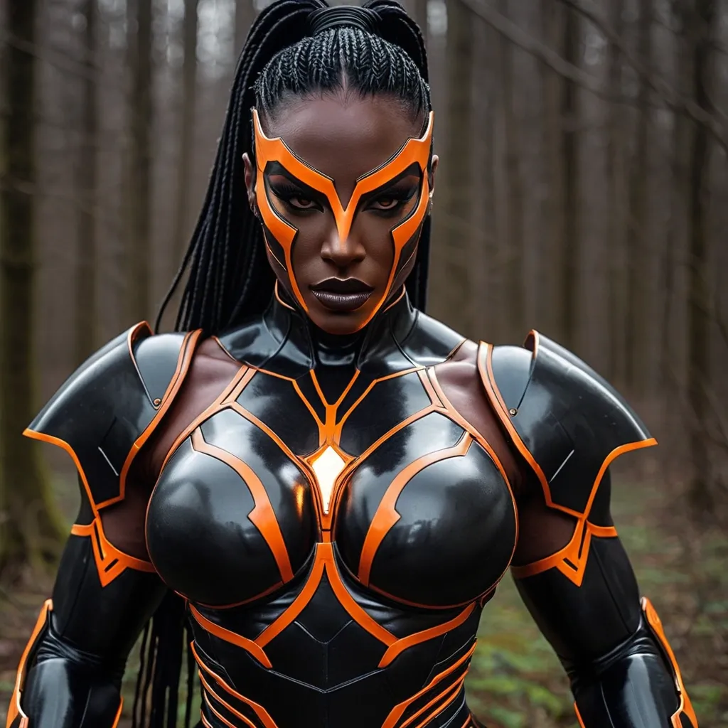 Stunning Dark-Skinned African-American woman radiating absolute power and futuristic dominance. - Face: Flawless deep ebony skin with a subtle luminous sheen , razor-sharp cheekbones , full glossy lips in a muted gunmetal-mauve shade , and perfectly sculpted brows that enhance her fierce expression. - Hair: Long , thick black braids gathered into a high , sleek ponytail that cascades down her back like a warrior’s banner , with the sides cornrowed tightly against her scalp for a clean , aggressive silhouette. - Body: Mind-blowingly muscular and statuesque — impossibly broad shoulders , cannonball delts , veiny biceps , a thick armored chest , and tree-trunk quads , all wrapped in glossy dark skin. The proportions are superheroic , almost mythic , with a tiny , corset-tight waist that defies physics. - Gorgeous hazel eyes: Piercing , glowing hazel-green irises that catch the light dramatically , intensified by the fiery orange lenses of her mask and long , thick lashes. - LO emblem on her chest: A bold , raised , metallic gold “LO” emblem centered directly on her massive , rounded chest plate , outlined in glowing orange piping that pulses faintly , like it’s powered by some inner energy source. - Pose: Frontal power stance , legs planted wide , fists clenched at her sides , shoulders squared , chin slightly raised — pure intimidation and readiness , every muscle flexed and on display. - Clothes: A skintight , high-tech black tactical bodysuit with armored segments , glossy like liquid obsidian. Dramatic orange-golden circuit-like lines run across the suit , accentuating every curve and cut of muscle. Heavy armored gauntlets and reinforced shoulder pads complete the battle-ready aesthetic. - Beauty: Devastatingly beautiful in an overwhelming , goddess-of-war way — the combination of soft , regal facial features with an ultra-jacked , hyper-muscular frame creates a breathtaking contrast of feminine elegance and raw , unstoppable strength. - Mask: A sleek , futuristic half-mask in glossy black with glowing orange accents that frame and intensify her eyes , giving her an almost cybernetic predator vibe while leaving her lower face exposed to show her fierce expression. She looks like the ultimate superheroine straight out of a high-budget sci-fi epic — unapologetic , invincible , and drop-dead gorgeous. ,