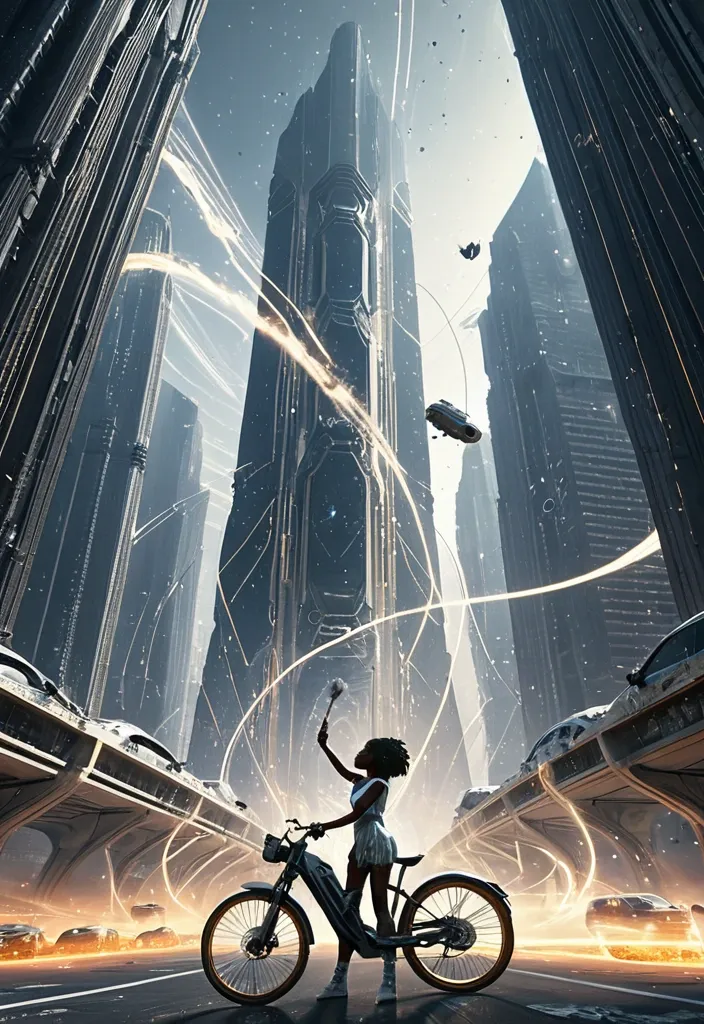 A African-female , standing on a desolate , alien planet , huge monolith vertical city where skyscrapers are connected by bridges and flying vehicles fly on sky , cars passing inside the building , Public Building. female standing with bike and taking selfie , female is created by laying golden threads are bent to create a shape without overlapping or intersecting , voluminous ethereal atmosphere. Style: Celestial , ethereal , abstract , digital art smoking: Dramatic backlighting , bright glowing particles , contrasting dark background Composition: dynamic diagonal composition , upward gaze Details: Sparkling white waves and smoke , streaking white light trails , sense of movement and wonder , magical atmosphere Quality: High detail , 4K , Masterpiece , Rendered in Octane ,