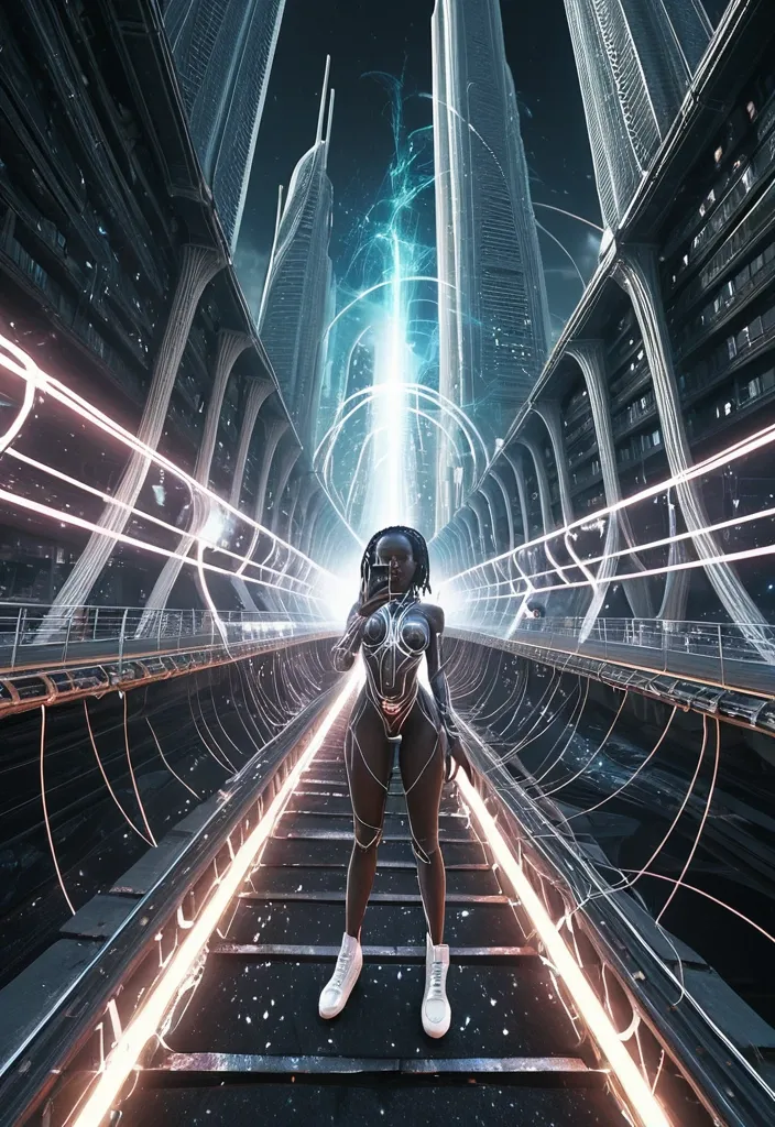 Fish eye view , a surreal bridge Melting by a African-female , standing on a desolate , alien planet , huge monolith vertical city where skyscrapers are connected by bridges and metros train running on track , trains passing inside the building , Public Building , Organic Futurism. female taking selfie , female is created by laying neon threads are bent to create a shape without overlapping or intersecting , Style: Celestial , ethereal , abstract , digital art smoking: Dramatic backlighting , bright glowing particles , contrasting dark background Composition: dynamic diagonal composition , upward gaze Details: Sparkling white waves and smoke , streaking white light trails , sense of movement and wonder , magical atmosphere Quality: High detail , 4K , Masterpiece , Rendered in Octane ,