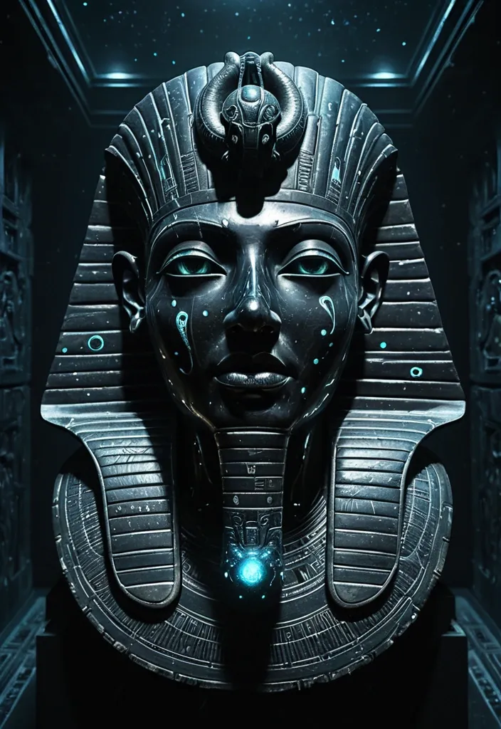 A colossal , ancient Egyptian pharaoh's mask , carved from obsidian and inlaid with glowing hieroglyphs , floats ominously in the void of deep space. Nebulae swirl around it like cosmic dust , and distant , alien stars cast an eerie , phosphorescent light. The mask's eyes seem to gaze into the viewer's soul , hinting at unfathomable cosmic horrors. Rendered in a hyperrealistic cinematic style with dramatic lighting and a deep , unsettling atmosphere , reminiscent of H.R. Giger's biomechanical surrealism. ,