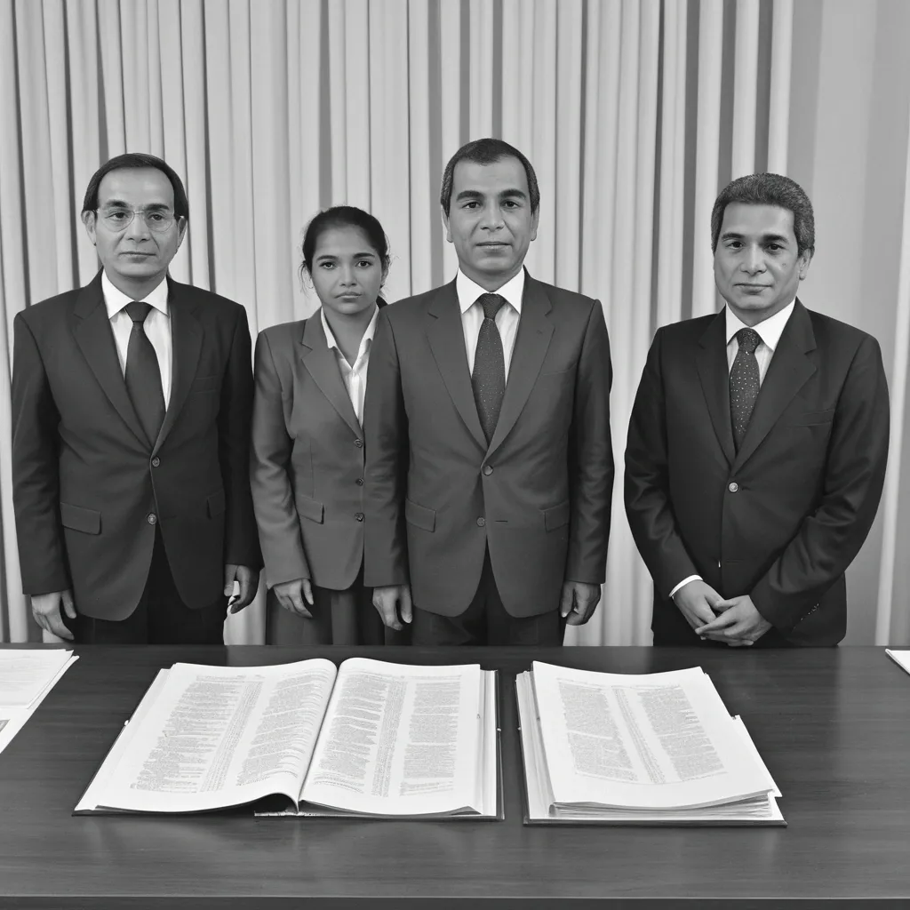 /imagine prompt: Plano medio hiperrealista de dos profesionales , una mujer de ascendencia Colombiana de aproximadamente 1 , 65 de altura , Cabello: Textura y Ondulación: El cabello presenta una textura que parece ser naturalmente lisa o ligeramente ondulada , estilizada con ondas amplias y suaves que comienzan aproximadamente a la altura de la mandíbula y se intensifican hacia las puntas. No se aprecian rizos definidos , sino más bien curvas fluidas que le dan movimiento y cuerpo. Capas y Corte: Aunque no se ve el corte en su totalidad , se intuye la presencia de capas , especialmente en las secciones frontales que enmarcan el rostro. Estas capas parecen ser largas , contribuyendo al volumen general y a la forma en que las ondas caen. Las puntas se ven relativamente sanas , aunque la iluminación y el procesamiento de la imagen podrían suavizar su apariencia real. Coloración y Reflejos: El color base es un castaño claro. Sobre esta base , se distribuyen reflejos o mechas (posiblemente una técnica como balayage o babylights) en tonos rubios más claros , que van desde un rubio miel hasta un rubio ceniza claro , más concentrados de medios a puntas y en los mechones que rodean el rostro. Estos reflejos aportan luminosidad y dimensión , creando un efecto tridimensional y evitando que el color se vea plano. Hay una transición suave entre los tonos. Distribución y Caída: El cabello parece tener una densidad media a abundante. Está peinado de manera que cae a ambos lados del rostro , cubriendo parcialmente los hombros. Los mechones frontales están ligeramente retirados o caen de forma que no ocultan completamente la frente. Se observa un ligero volumen en la coronilla , aunque el ángulo de la foto no permite verla con claridad. Brillo y Estado Aparente: El cabello tiene un brillo saludable , reflejando la luz de manera uniforme en las zonas más claras , lo que sugiere una buena condición o el uso de productos que potencian el brillo. Rostro: Ovalado. Frente: La frente es de amplitud media , proporcionada con el resto del rostro. La línea del cabello parece ser suave y ligeramente redondeada. No se aprecian líneas de expresión marcadas en la frente , aunque la calidad de la imagen y el maquillaje podrían disimularlas. La piel de la frente se ve lisa. Ojos: Forma y Párpados: Son de forma almendrada , con el ángulo externo ligeramente ascendente. Los párpados superiores son visibles y tienen un pliegue bien definido. El maquillaje de sombras oscuras se concentra en el párpado móvil y en la cuenca , creando profundidad. Pestañas y Delineado: Las pestañas superiores son largas , oscuras y curvadas , posiblemente realzadas con máscara de pestañas de volumen o extensiones/pestañas postizas sutiles. El delineado negro es preciso y grueso , siguiendo la línea de las pestañas superiores y extendiéndose ligeramente más allá del rabillo del ojo , aunque el "ala" completa no es claramente visible. La línea de agua inferior no parece estar delineada de forma marcada , o si lo está , es con un tono claro o muy sutil. Cejas: Las cejas están cuidadosamente perfiladas y maquilladas , con un arco definido y una cola que se adelgaza. El relleno les da una apariencia densa y uniforme , en un tono marrón que armoniza con el color del cabello. Están bien separadas en el entrecejo. Zona Inferior del Ojo: El área debajo de los ojos se ve lisa , con el maquillaje cubriendo cualquier posible ojera o línea fina. Nariz: liqueramente achatada tendiendo a ser un poco pequeña Pómulos: Son prominentes y bien definidos , contribuyendo a una estructura facial esculpida. El maquillaje (rubor y posiblemente contorno) acentúa esta prominencia , con un color cálido aplicado en la parte superior de las mejillas , difuminándose hacia las sienes. Mejillas: Las mejillas son suaves y llenas debajo de los pómulos , afinándose hacia la línea de la mandíbula. No se aprecian hoyuelos. La transición entre el pómulo y la mejilla es suave. Nariz: La nariz es recta en su puente , de longitud y anchura proporcionadas. Las fosas nasales son simétricas y no especialmente dilatadas. La punta de la nariz es redondeada y bien definida. No se observan particularidades como desviaciones o marcas evidentes. Labios: Forma y Grosor: Son labios de grosor medio-alto , con el labio inferior ligeramente más lleno que el superior. El arco de Cupido del labio superior es suavemente pronunciado y simétrico. Las comisuras de los labios están neutras , no se inclinan hacia arriba ni hacia abajo en esta expresión. Textura y Maquillaje: Están maquillados con un color labial mate o semi-mate en un tono terracota-rojizo. La aplicación es uniforme y cubre toda la superficie del labio. No se aprecian grietas ni sequedad extrema , aunque la textura intrínseca del labio (líneas finas naturales) está oculta por el labial. Mentón: El mentón es redondeado y proporcionado con la mandíbula. No se aprecia un hoyuelo en el mentón. Se integra suavemente con la línea de la mandíbula. Línea de la Mandíbula: La línea de la mandíbula es visible y define el contorno inferior del rostro , afinándose desde los ángulos mandibulares hacia el mentón , lo que contribuye a la forma ovalada/corazón del rostro. Señales Particulares: Piel: La piel del rostro , en general , se ve lisa y con una tonalidad uniforme , lo cual es probablemente el resultado del maquillaje (base , corrector). No se observan a simple vista pecas , lunares prominentes , cicatrices u otras marcas distintivas en las áreas visibles del rostro. Cualquier textura fina de la piel o poros están minimizados por el maquillaje y la calidad de la imagen. Simetría: El rostro presenta un alto grado de simetría bilateral en sus rasgos principales (ojos , cejas , pómulos , labios).. y elegantemente vestida (representando Talento Humano) y un hombre de ascendencia europea (representando Salud y Seguridad en el Trabajo) , ambos de entre 35-45 años , inm