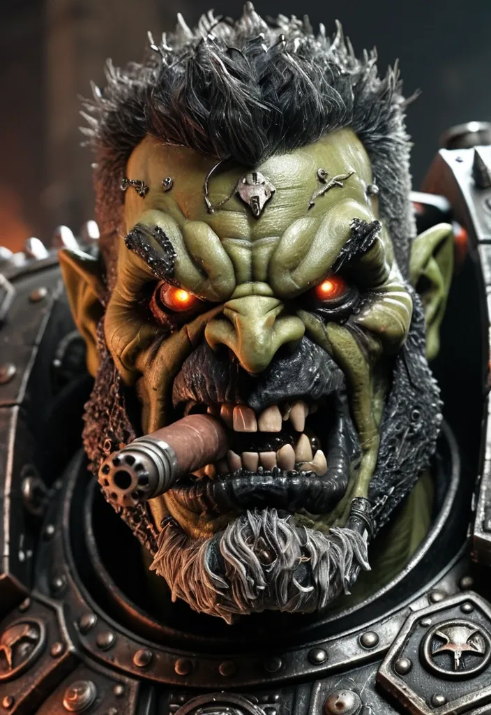 close - up portrait of a (Use the uploaded image1 as the sole and 100% exact only face) fearsome , likeness of the man. , Warhammer 40 , 000 Space Ork Sector Warboss. Frightening , Fangs and long curly white mustache , massive square jaw with underbite , cybernetic eye , smoking lit cigar , Heavy and crude industrial sci - fi armour , brutal weapons ,