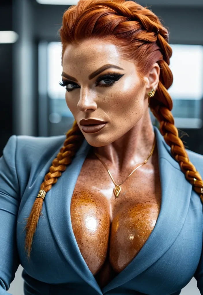 Generate Gorgeous female boss , bimbo , hourglass body , abnormally massive female bodybuilder , gorgeous , close up , full lips , big booty , redheaded , freckles on face and breast , braided design hair , feminine silhouette , too big breast , big booty , sexy thighs abs , silhouette , up close , flexing biceps , beautiful green eyes , legs are iconic and defining physical feature , both visually and in terms of combat ability.wearing an outfit that is a striking blend of elegance , power , and femininity , designed to command attention in any room. The suit is tailored to perfection , hugging the wearer’s curves with precision while emphasizing a structured silhouette. The fabric itself is a refined grey tweed patterned with subtle white grid lines , giving the suit a texture that feels both sophisticated and modern. The blazer features broad blue lapels and gold button accents , adding a luxurious touch that elevates the look beyond typical business attire. The matching high-waisted trousers elongate the frame , further enhancing the poised and commanding effect of the ensemble.The styling choices amplify the boldness of the suit. The inner blouse is a silky , greybutton-down shirt that complements the tweed’s tone while introducing a softer , feminine balance to the sharp tailoring of the jacket. The blouse peeks out neatly from under the blazer , maintaining elegance without drawing focus away from the suit’s commanding cut. Accessories are kept minimal yet intentional: a delicate layered gold necklace and hoop earrings that add glimmers of light and luxury without overpowering the outfit. The choice of voluminous , honey-brown braids cascading down her shoulders frames the face with both confidence and glamour , completing the commanding visual.Altogether , this look communicates a blend of authority and allure. It is business-ready yet fashion-forward , balancing corporate structure with vibrant femininity. The color palette blue , grey and gold avoids being overly delicate , instead embracing the richness of texture , structure , and presence. This is the kind of ensemble that speaks to ambition , sophistication , and personal style—ideal for someone who thrives in positions of influence but insists on expressing her individuality with bold elegance. It’s not just clothing—it’s a statement of power wrapped in grace. Stacked hourglass silhouette ,