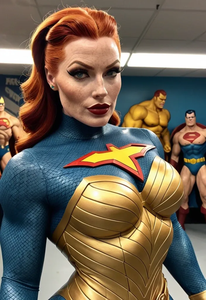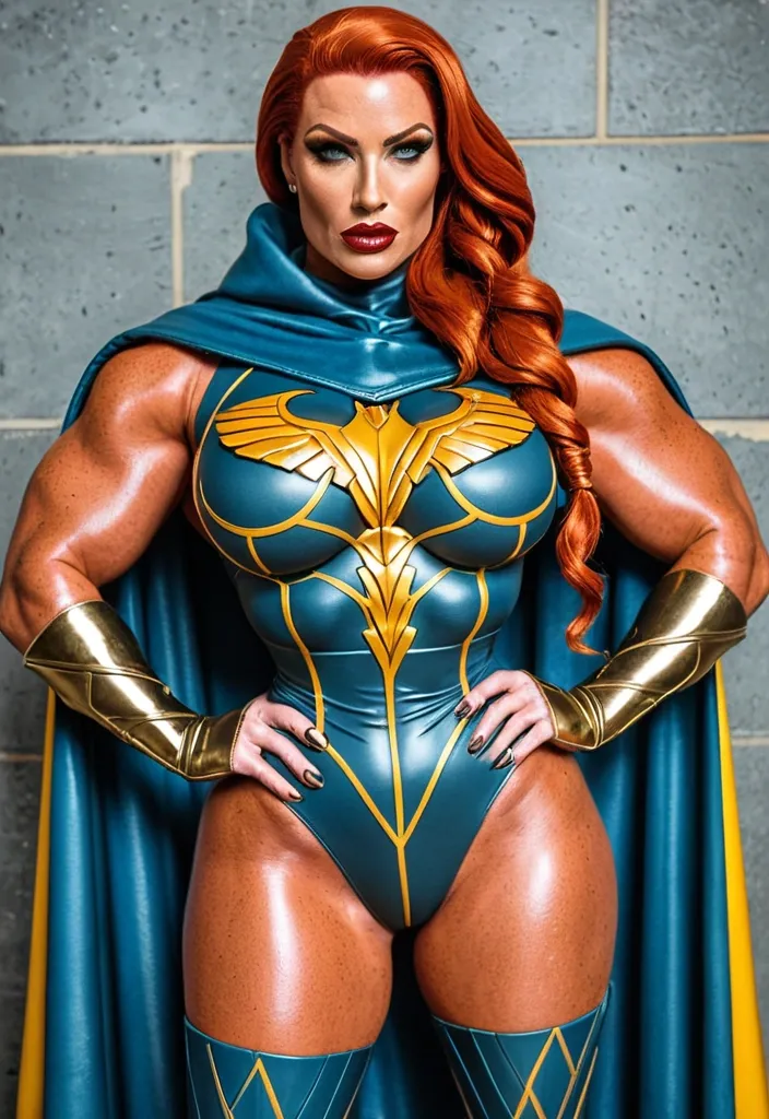 Generate Gorgeous female boss , bimbo , hourglass body , abnormally massive female bodybuilder , gorgeous , close up , full lips , big booty , redheaded , freckles on face and breast , braided design hair , feminine silhouette , too big breast , big booty , sexy thighs abs , silhouette , up close , flexing biceps , beautiful green eyes , legs are iconic and defining physical feature , both visually and in terms of combat ability.wearing an outfit that is a striking blend of elegance , power , and femininity , designed to command attention in any room. The suit is tailored to perfection , hugging the wearer’s curves with precision while emphasizing a structured silhouette. The fabric itself is a refined grey tweed patterned with subtle white grid lines , giving the suit a texture that feels both sophisticated and modern. The blazer features broad blue lapels and gold button accents , adding a luxurious touch that elevates the look beyond typical business attire. The matching high-waisted trousers elongate the frame , further enhancing the poised and commanding effect of the ensemble.The styling choices amplify the boldness of the suit. The inner blouse is a silky , greybutton-down shirt that complements the tweed’s tone while introducing a softer , feminine balance to the sharp tailoring of the jacket. The blouse peeks out neatly from under the blazer , maintaining elegance without drawing focus away from the suit’s commanding cut. Accessories are kept minimal yet intentional: a delicate layered gold necklace and hoop earrings that add glimmers of light and luxury without overpowering the outfit. The choice of voluminous , honey-brown braids cascading down her shoulders frames the face with both confidence and glamour , completing the commanding visual.Altogether , this look communicates a blend of authority and allure. It is business-ready yet fashion-forward , balancing corporate structure with vibrant femininity. The color palette blue , grey and gold avoids being overly delicate , instead embracing the richness of texture , structure , and presence. This is the kind of ensemble that speaks to ambition , sophistication , and personal style—ideal for someone who thrives in positions of influence but insists on expressing her individuality with bold elegance. It’s not just clothing—it’s a statement of power wrapped in grace. In luxury living legs that could crush a watermelon , skirt high boots are a bold and striking statement piece , crafted in glossy black patent leather that gives them a sleek , polished finish. Rising to just below the knee , the boots feature three adjustable buckle straps along the shaft , adding both edge and detail to their design. The towering stiletto heel , paired with a thick platform sole , creates an ultra-dramatic silhouette that elongates the leg and exudes power and confidence. With their combination of shine , height , and structure , these boots perfectly balance fierce femininity with high-fashion allure.The woman in the image wears a striking 1940s-inspired superhero outfit that exudes strength and elegance. Her form-fitting bodysuit is a deep , muted teal-gray with a subtle textured finish , hugging her curves while allowing for mobility. A dramatic high-collared cape in matching fabric drapes over her shoulders , adding a regal silhouette. At the center of her chest is a prominent golden eagle emblem with outstretched wings , symbolizing power and patriotism typical of the Golden Age of comics. Golden armored gauntlets cover her forearms and hands , intricately detailed with feather-like patterns that echo the eagle motif , while a wide golden belt with a V-shaped buckle cinches her waist , accentuating her confident stance with hands on hips. Her vibrant red hair is styled in soft victory rolls , complementing the vintage aesthetic , and she completes the look with dangling gold earrings and bold red lipstick , blending classic femininity with heroic authority. The overall design evokes the bold , iconic style of 1940s comic book hero golden eagle on chest , grayish blue leather patterned bodysuit , gold cape , gold high boots , hood , and half , mask ,
