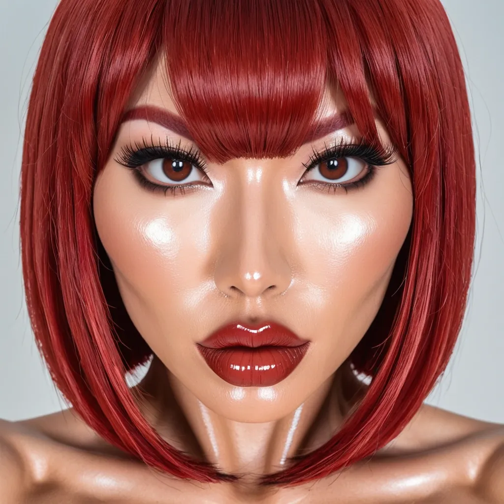 Generate Gorgeous female boss , Japanese woman , pointy face , bimbo , hourglass body , abnormally massive female bodybuilder , gorgeous , close up , full lips , big booty , red hair breast , bob-cut , bangs cover forhead design hair , feminine silhouette , too big breast , big booty , sexy thighs abs , silhouette , up close , flexing biceps , beautiful green eyes , legs are iconic and defining physical feature , both visually and in terms of combat ability.wearing an outfit that is a striking blend of elegance , power , and femininity , designed to command attention in any room. The suit is tailored to perfection , hugging the wearer’s curves with precision while emphasizing a structured silhouette. The fabric itself is a refined grey tweed patterned with subtle white grid lines , giving the suit a texture that feels both sophisticated and modern. The blazer features broad blue lapels and gold button accents , adding a luxurious touch that elevates the look beyond typical business attire. The matching high-waisted trousers elongate the frame , further enhancing the poised and commanding effect of the ensemble.The styling choices amplify the boldness of the suit. The inner blouse is a silky , greybutton-down shirt that complements the tweed’s tone while introducing a softer , feminine balance to the sharp tailoring of the jacket. The blouse peeks out neatly from under the blazer , maintaining elegance without drawing focus away from the suit’s commanding cut. Accessories are kept minimal yet intentional: a delicate layered gold necklace and hoop earrings that add glimmers of light and luxury without overpowering the outfit. The choice oframes the face with both confidence and glamour , completing the commanding visual.Altogether , this look communicates a blend of authority and allure. It is business-ready yet fashion-forward , balancing corporate structure with vibrant femininity. The color palette blue , grey and gold avoids being overly delicate , instead embracing the richness of texture , structure , and presence. This is the kind of ensemble that speaks to ambition , sophistication , and personal style—ideal for someone who thrives in positions of influence but insists on expressing her individuality with bold elegance. It’s not just clothing—it’s a statement of power wrapped in grace. In luxury living legs that could crush a watermelon , skirt high boots are a bold and striking statement piece , crafted in glossy black patent leather that gives them a sleek , polished finish. Rising to just below the knee , the boots feature three adjustable buckle straps along the shaft , adding both edge and detail to their design. The towering stiletto heel , paired with a thick platform sole , creates an ultra-dramatic silhouette that elongates the leg and exudes power and confidence. With their combination of shine , height , and structure , these boots perfectly balance fierce femininity with high-fashion allure. Gorgeous brown eyes , nose ring , big lips glossy lips , enormous breast , enormous butt , scowl on face ,