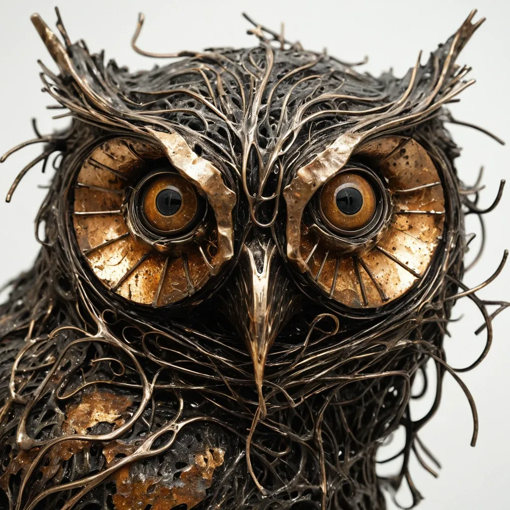 A haunting , close-up portrait of a owl’s face , rendered in a heavily textured and abstract style. The bird’s features seem to coalesce from a chaotic swirl of copper , bronze , and deep charcoal pigments. Its large , glass-like eyes are dark and reflective , devoid of pupils , staring forward with a hollow intensity. The fur is represented by sharp , leaf-like shards and wispy , smoke-like tendrils that dissolve into a mottled off-white background. Splashes of metallic gold and burnt orange create the illusion of decaying organic matter or molten metal cooling on the skin. The nose is a subtle , dark indentation , and fine , wire-thin whiskers sprout sporadically from the muzzle. The overall atmosphere is one of beautiful decay , blending the organic form of a feline with the cold , fractured essence of a crumbling sculpture. ,