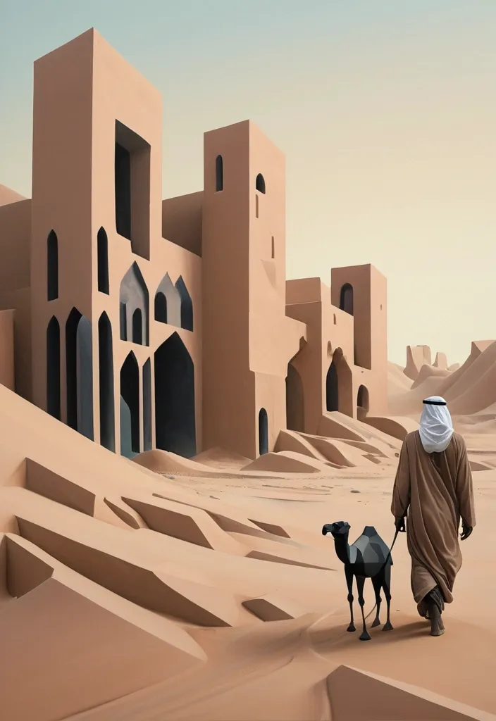 An abstract representation of a forgotten memory , visualized as a landscape of shifting geometric shapes and impossible mud architecture. Soft pastel colors blend with stark , obsidian forms , creating a dreamlike yet unsettling environment , Arabian man with camel walk. The overall impression is of an ethereal , fleeting thought caught in mid-dissipation. ,