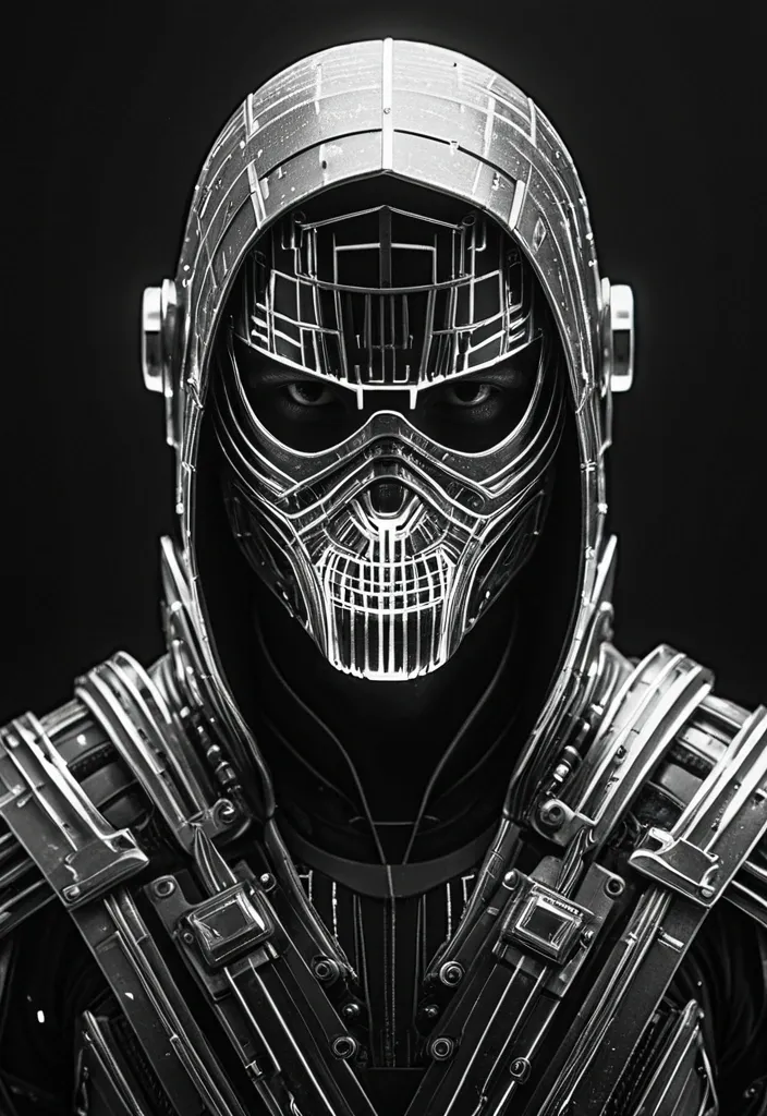 Hyper LED glitched monochrome portrait. An ultra-detailed hyper close-up of a dystopian cyber punk samurai warrior’s full-body , adorned with a cyber kinetic hyper artificial designed veil that refracts light into very subtle rainbows. His face was covered with a minimalistic mask , so only his eyes only were visible. He appeared to be a brave white man. Soft , ethereal light from the right highlights his skin and sharp features , against a cosmic darker heavy storm background with faint thunders. 16K. Truly HD. Unexpectedly low-angled shot of his full-body. Hyper realism. The entire screen is bright and dazzlingly vivid. The high resolution and fine details , along with the slightly blur , are reminiscent of an electron microscope with sharp effect specially strongly. ,