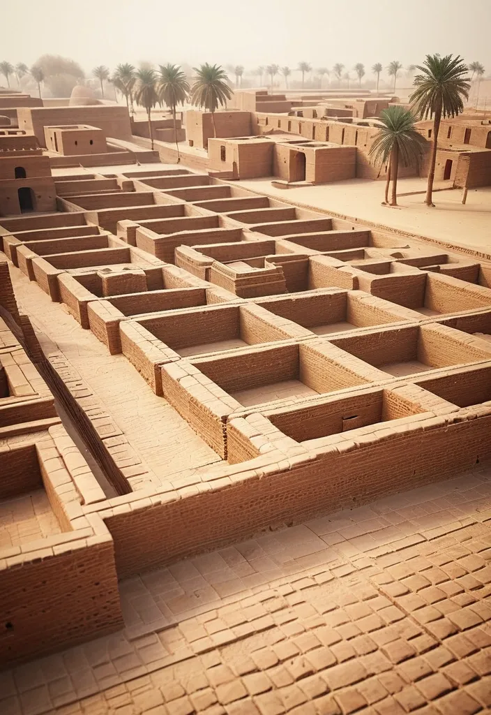 Mohenjo-daro , Indus Valley Civilization city , grid of baked brick streets and courtyards beside the Indus River , stepped well and granary under hazy sun , palm trees at the edge , dry season midday , Style: hyperrealistic with a painterly texture , reminiscent of historical reconstruction art , detailed and atmospheric with subtle depth of field , Wide view , Side View , 4K. ,