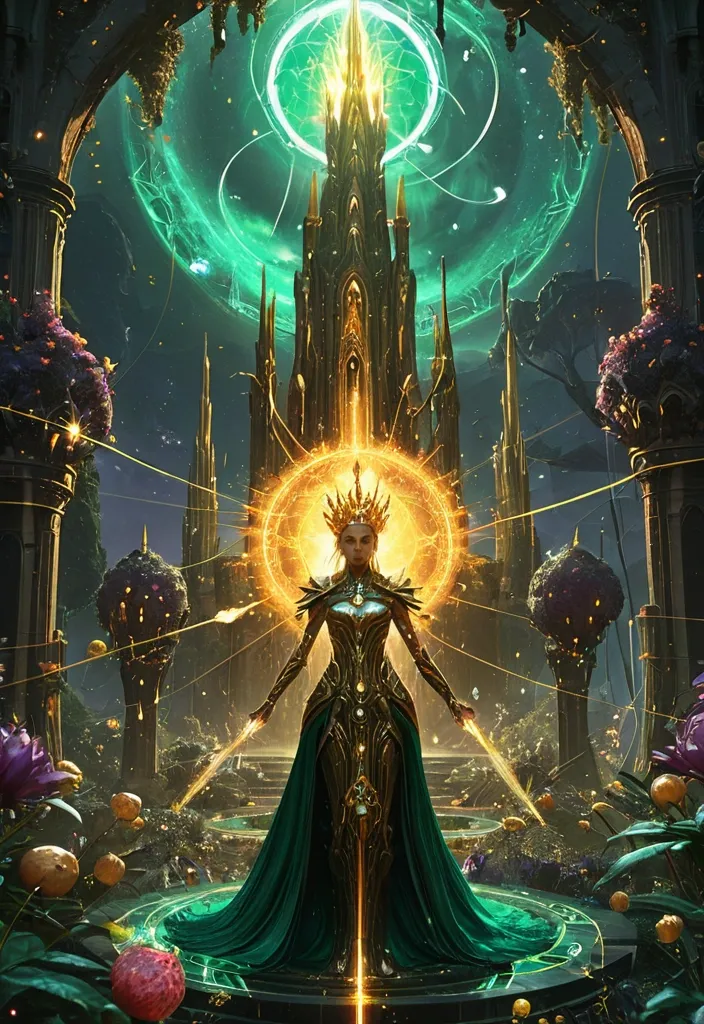 **Masterpiece digital painting , epic fantasy art. Central towering crystal spire exploding with golden lightning (Tower XVI) , shattering black chains (Swords 8) in mid-air. Below , a lush , glowing garden of alien flora (Disk 9) with pomegranate trees and luminous flowers. A serene queen (Queen of Disks) stands in the garden , one hand touching the earth , the other catching falling stars. Style: A mix of Amano's elegance and Greg Rutkowski's depth. Color palette: Emerald green , deep violet , celestial gold , and volcanic orange. Hyperdetailed , mystical atmosphere , divine light rays , 8K , cinematic composition.** ,