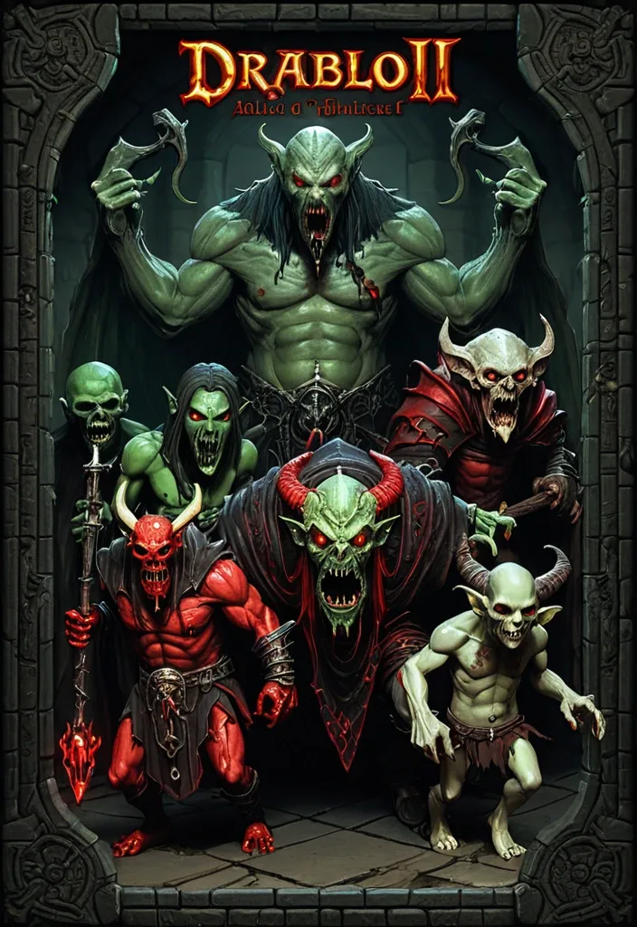 Изобрази существ загробного мира , которые выбегают из подземелья. Существа: Вурдалак , Вампир , Некромант с головой жука , Огр-людоед , два гоблина (зеленый и алый) , демон рогатый и дух тьмы (призрак). На подземелье выгравировано: "Roguelike". Надпись объемная. Стиль Age of Mythology в комбо с Diablo II. ,
