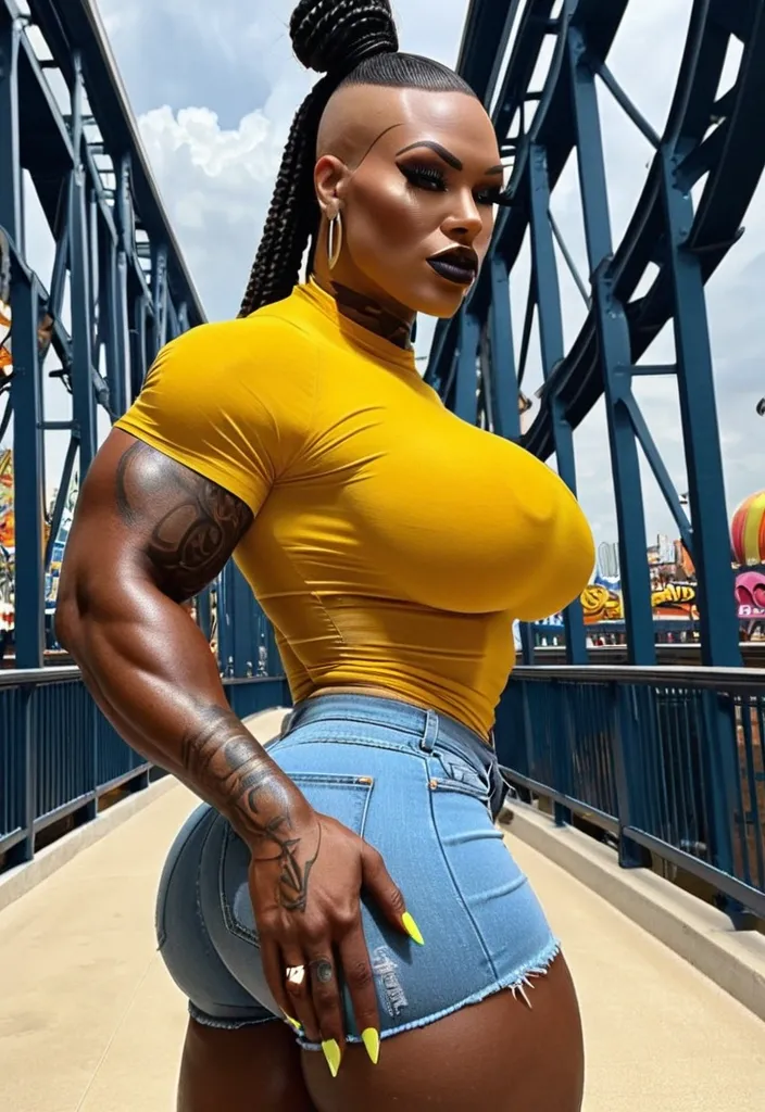 Generate Gorgeous female boss , bimbo , dark-skinned very African-American female , hourglass body , abnormally massive female bodybuilder , gorgeous , close up , full lips , big booty , brown , on face and breast , braided styled mohawk , bald on the side , shaved on the side , feminine silhouette , too big breast , big booty , sexy thighs abs , silhouette , up close , flexing biceps , beautiful green eyes , legs are iconic and defining physical feature , both visually and in terms of combat ability.wearing an outfit that is a striking blend of elegance , power , and femininity , designed to command attention in any room. The suit is tailored to perfection , hugging the wearer’s curves with precision while emphasizing a structured silhouette. The fabric itself is a refined grey tweed patterned with subtle white grid lines , giving the suit a texture that feels both sophisticated and modern. The blazer features broad blue lapels and gold button accents , adding a luxurious touch that elevates the look beyond typical business attire. The matching high-waisted trousers elongate the frame , further enhancing the poised and commanding effect of the ensemble.The styling choices amplify the boldness of the suit. The inner blouse is a silky , greybutton-down shirt that complements the tweed’s tone while introducing a softer , feminine balance to the sharp tailoring of the jacket. The blouse peeks out neatly from under the blazer , maintaining elegance without drawing focus away from the suit’s commanding cut. Accessories are kept minimal yet intentional: a delicate layered gold necklace and hoop earrings that add glimmers of light and luxury without overpowering the outfit. The choice of voluminous , honey-brown braids cascading down her shoulders frames the face with both confidence and glamour , completing the commanding visual.Altogether , this look communicates a blend of authority and allure. It is business-ready yet fashion-forward , balancing corporate structure with vibrant femininity. The color palette blue , grey and gold avoids being overly delicate , instead embracing the richness of texture , structure , and presence. This is the kind of ensemble that speaks to ambition , sophistication , and personal style—ideal for someone who thrives in positions of influence but insists on expressing her individuality with bold elegance. It’s not just clothing—it’s a statement of power wrapped in grace. In luxury living legs that could crush a watermelon , skirt high boots are a bold and striking statement piece , crafted in glossy black patent leather that gives them a sleek , polished finish. Rising to just below the knee , the boots feature three adjustable buckle straps along the shaft , adding both edge and detail to their design. The towering stiletto heel , paired with a thick platform sole , creates an ultra-dramatic silhouette that elongates the leg and exudes power and confidence. With their combination of shine , height , and structure , these boots perfectly balance fierce femininity with high-fashion allure. High cheekbones , prominent jawline , gorgeous big light reflecting hazel eyes , enormous breast , cartoon bunny on yellow t-shirt-shirt , denim shorts , denim walking in amusement park , enormous butt , ebbreast , thunder thighs and hips ,