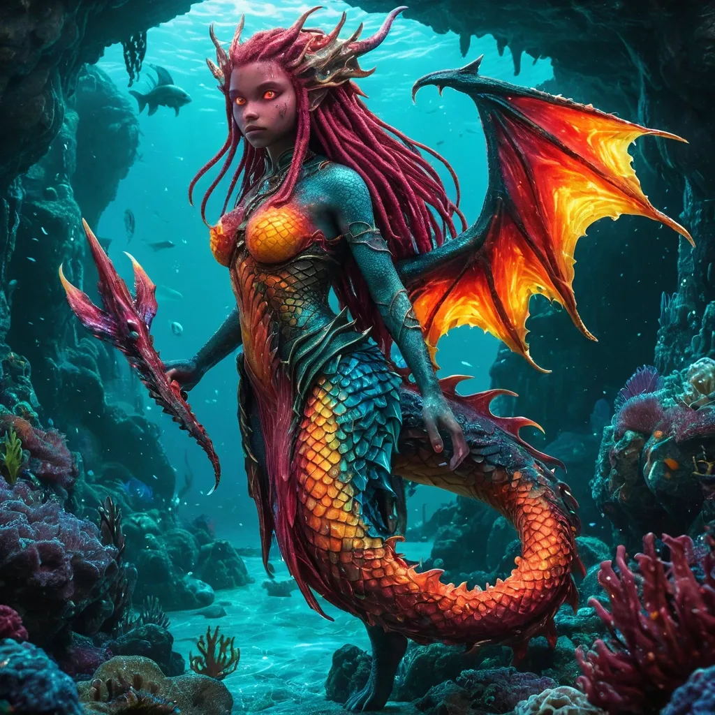 Make an underwater hybrid picture of a mermaid and a dragon. The creature should have the head of a dragon , like in Game of Thrones. The wings are huge and look like glowing lava , colors red , orange , and yellow. The hybrid's body is covered in teal , sky blue , royal blue , and indigo blue scales. The tail has a jagged fin. The dragon's face has high cheekbones bony and big red eyes. The hair has long , dark pink dreadlocks , and has seaweed and kelp entangled in it. The background has an underwater cave entrance and sharks swimming. The creature has a glowing green aura around it. ,