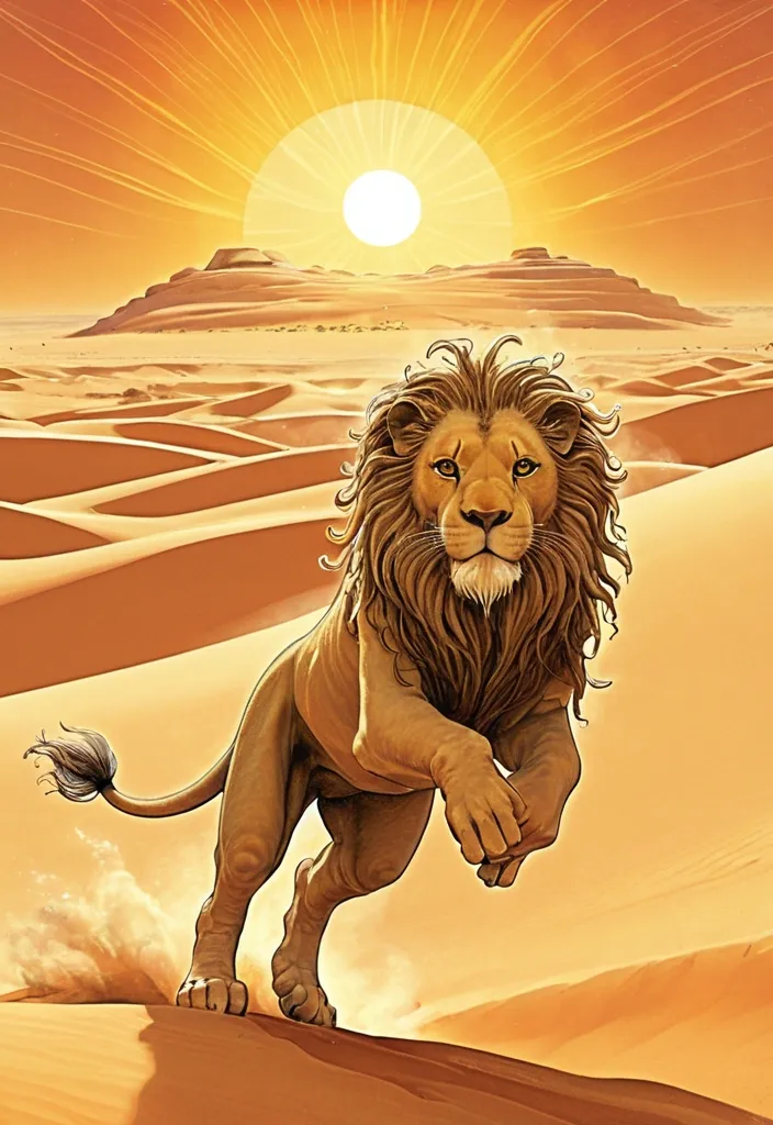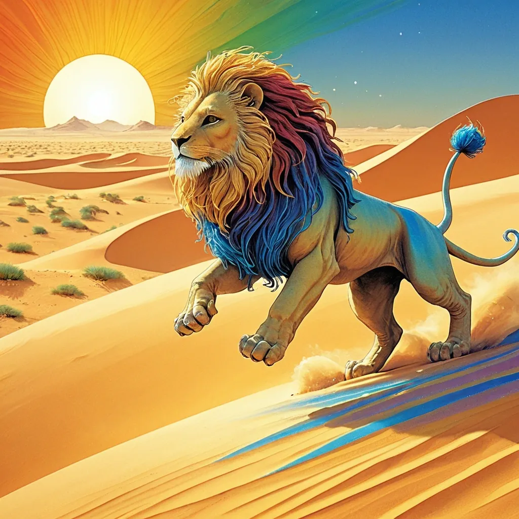 Fairy tale book illustration of the male lion from Michael Ende's The Neverending Story. The male lion is jumping from dune to dune in Goba , the Desert of Colors. Each dune has a different color of the rainbow , from silver to gold , indigo blue to turquoise , red to yellow , and so on. Include as many dunes as you like. The sun is blazing hot above the desert , presenting a mirage in the background. ,