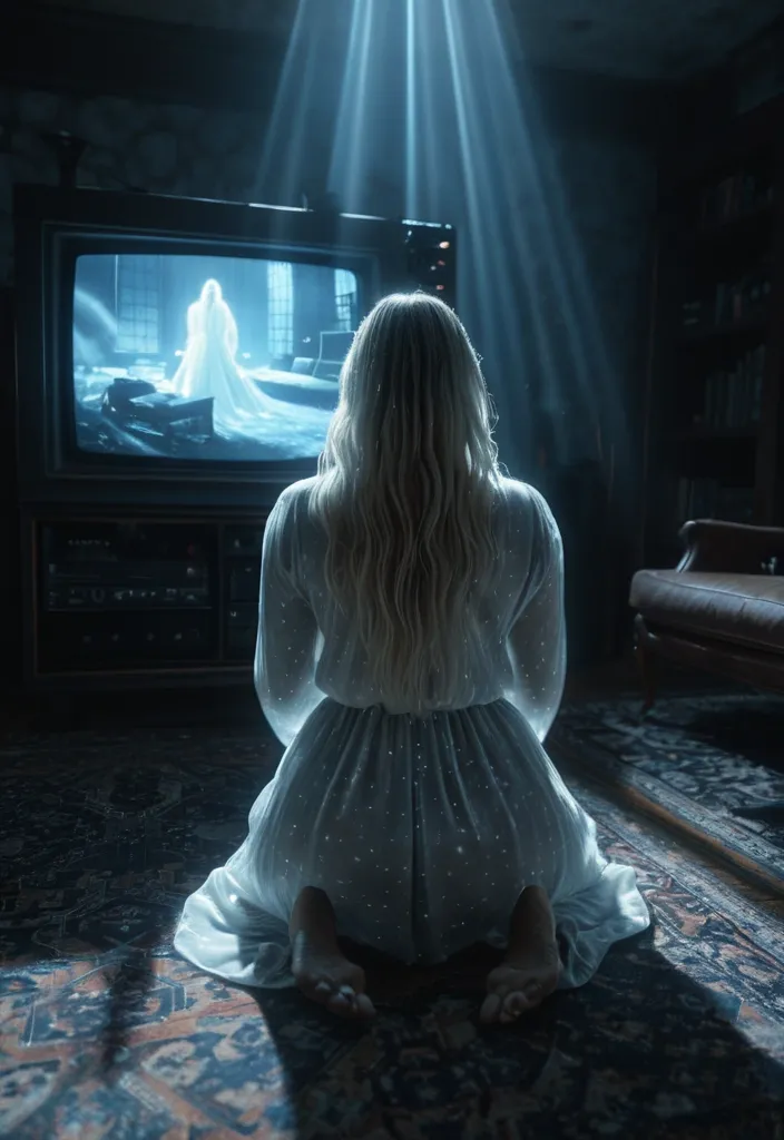 Ultra-realistic cinematic 8K HDR scene inspired by the movie "Poltergeist" (1982) a small girl kneeling in front of an old 1980s television set glowing with white static noise she wears a light nightgown or pajamas , her long blonde hair illuminated by the cold bluish glow of the TV both hands gently touching the screen , creating a faint reflection and subtle distortion of her silhouette the dark living room around her is filled with shadows and faint outlines of furniture , toys scattered on the carpet soft volumetric light rays from the static flicker through the air , dust particles floating , faint ghostly glow emanating from the TV atmosphere eerie , silent , and supernatural , a sense of mystery and dread cinematic depth of field , ultra-detailed 3D photorealistic textures of hair , static light , and fabric IMAX-level realism , Unreal Engine 5 rendering , HDR color contrast , Canon EOS R5 35mm f/1.4 lens , masterpiece horror composition , haunting and iconic --ar 16:9 --raw --stylize 750 --v 6 ,