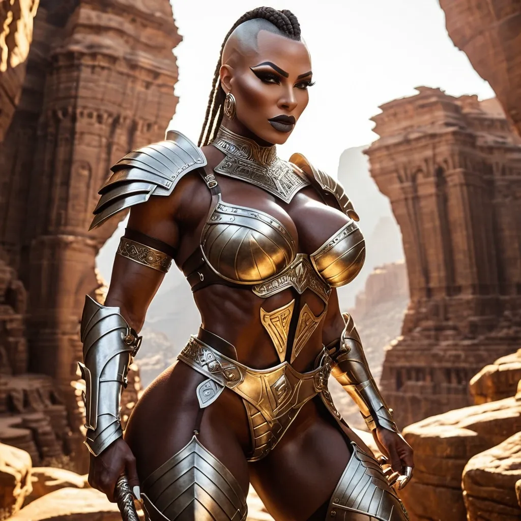 Generate Gorgeous female boss , bimbo , dark-skinned very African-American female , hourglass body , abnormally massive female bodybuilder , gorgeous , close up , full lips , big booty , brown , on face and breast , braided styled mohawk , bald on the side , shaved on the side , feminine silhouette , too big breast , big booty , sexy thighs abs , silhouette , up close , flexing biceps , beautiful green eyes , legs are iconic and defining physical feature , both visually and in terms of combat ability.wearing an outfit that is a striking blend of elegance , power , and femininity , designed to command attention in any room. The suit is tailored to perfection , hugging the wearer’s curves with precision while emphasizing a structured silhouette. The fabric itself is a refined grey tweed patterned with subtle white grid lines , giving the suit a texture that feels both sophisticated and modern. The blazer features broad blue lapels and gold button accents , adding a luxurious touch that elevates the look beyond typical business attire. The matching high-waisted trousers elongate the frame , further enhancing the poised and commanding effect of the ensemble.The styling choices amplify the boldness of the suit. The inner blouse is a silky , greybutton-down shirt that complements the tweed’s tone while introducing a softer , feminine balance to the sharp tailoring of the jacket. The blouse peeks out neatly from under the blazer , maintaining elegance without drawing focus away from the suit’s commanding cut. Accessories are kept minimal yet intentional: a delicate layered gold necklace and hoop earrings that add glimmers of light and luxury without overpowering the outfit. The choice of voluminous , honey-brown braids cascading down her shoulders frames the face with both confidence and glamour , completing the commanding visual.Altogether , this look communicates a blend of authority and allure. It is business-ready yet fashion-forward , balancing corporate structure with vibrant femininity. The color palette blue , grey and gold avoids being overly delicate , instead embracing the richness of texture , structure , and presence. This is the kind of ensemble that speaks to ambition , sophistication , and personal style—ideal for someone who thrives in positions of influence but insists on expressing her individuality with bold elegance. It’s not just clothing—it’s a statement of power wrapped in grace. In luxury living legs that could crush a watermelon , skirt high boots are a bold and striking statement piece , crafted in glossy black patent leather that gives them a sleek , polished finish. Rising to just below the knee , the boots feature three adjustable buckle straps along the shaft , adding both edge and detail to their design. The towering stiletto heel , paired with a thick platform sole , creates an ultra-dramatic silhouette that elongates the leg and exudes power and confidence. With their combination of shine , height , and structure , these boots perfectly balance fierce femininity with high-fashion allure. High cheekbones , prominent jawline , gorgeous big light reflecting hazel eyes , enormous breast , She wears a heroic fantasy outfit with a polished silver-and-gold armored top , matching belt and hip guards , ornate bracers , and a circlet , while gripping twin swords raised confidently at her sides.The scene is set among towering sunlit stone ruins or canyon pillars , with warm golden light behind her that creates a triumphant , epic high-fantasy atmosphere. enormous butt , enormous breast , thunder thighs and hips ,