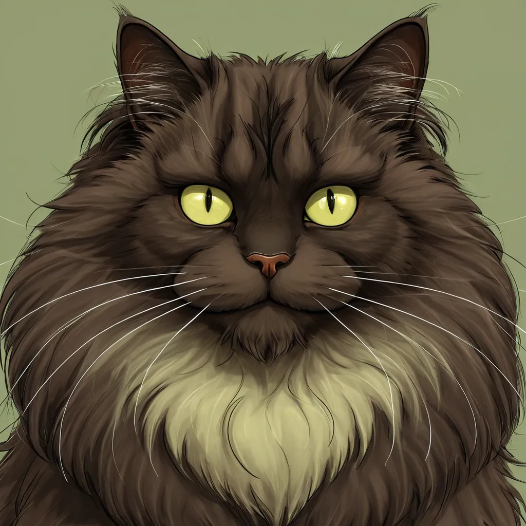 Draw a caricature of a chocolate brown and black long-haired ragdoll cat with greenish yellow eyes. The cat has a condescending , "what do you want from me , bro" smirk. The eyes are half closed. The cat has a broad nose , huge black whiskers and eyebrows , and prominent furs in its ears. It has furry paws , like a Norwegian forest cat. ,