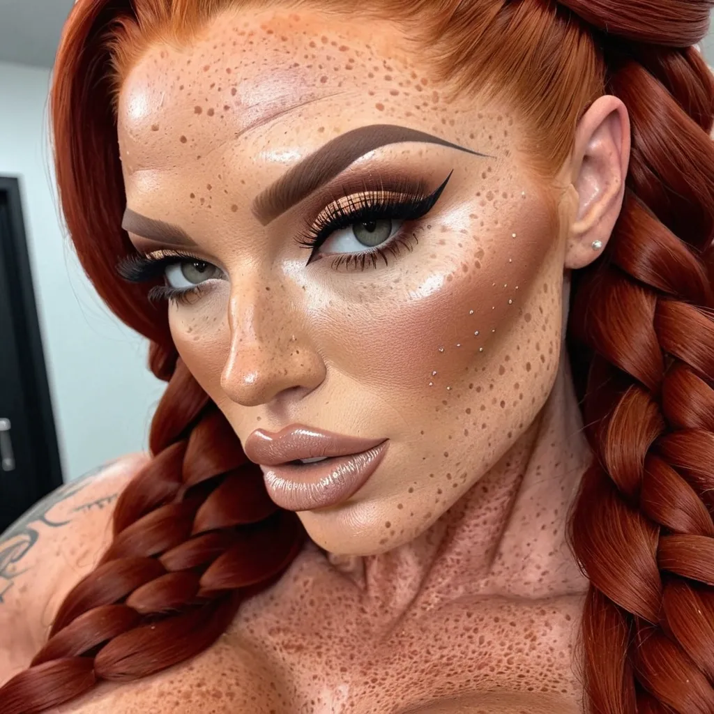 Generate Gorgeous female boss , bimbo , hourglass body , abnormally massive female bodybuilder , gorgeous , close up , full lips , big booty , redheaded , freckles on face and breast , braided design hair , feminine silhouette , too big breast , big booty , sexy thighs abs , silhouette , up close , flexing biceps , beautiful green eyes , legs are iconic and defining physical feature , both visually and in terms of combat ability.wearing an outfit that is a striking blend of elegance , power , and femininity , designed to command attention in any room. The suit is tailored to perfection , hugging the wearer’s curves with precision while emphasizing a structured silhouette. The fabric itself is a refined grey tweed patterned with subtle white grid lines , giving the suit a texture that feels both sophisticated and modern. The blazer features broad blue lapels and gold button accents , adding a luxurious touch that elevates the look beyond typical business attire. The matching high-waisted trousers elongate the frame , further enhancing the poised and commanding effect of the ensemble.The styling choices amplify the boldness of the suit. The inner blouse is a silky , greybutton-down shirt that complements the tweed’s tone while introducing a softer , feminine balance to the sharp tailoring of the jacket. The blouse peeks out neatly from under the blazer , maintaining elegance without drawing focus away from the suit’s commanding cut. Accessories are kept minimal yet intentional: a delicate layered gold necklace and hoop earrings that add glimmers of light and luxury without overpowering the outfit. The choice of voluminous , honey-brown braids cascading down her shoulders frames the face with both confidence and glamour , completing the commanding visual.Altogether , this look communicates a blend of authority and allure. It is business-ready yet fashion-forward , balancing corporate structure with vibrant femininity. The color palette blue , grey and gold avoids being overly delicate , instead embracing the richness of texture , structure , and presence. This is the kind of ensemble that speaks to ambition , sophistication , and personal style—ideal for someone who thrives in positions of influence but insists on expressing her individuality with bold elegance. It’s not just clothing—it’s a statement of power wrapped in grace. In luxury living legs that could crush a watermelon , skirt high boots are a bold and striking statement piece , crafted in glossy black patent leather that gives them a sleek , polished finish. Rising to just below the knee , the boots feature three adjustable buckle straps along the shaft , adding both edge and detail to their design. The towering stiletto heel , paired with a thick platform sole , creates an ultra-dramatic silhouette that elongates the leg and exudes power and confidence. With their combination of shine , height , and structure , these boots perfectly balance fierce femininity with high-fashion allure. ,