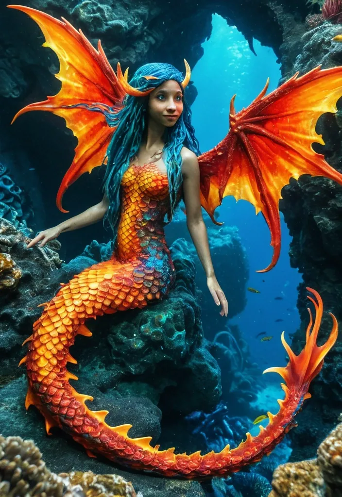 Make an underwater hybrid picture of a mermaid and a dragon. The creature should have the head of a dragon. The wings are huge and look like glowing lava , colors red , orange , and yellow. The hybrid's body is covered in teal , sky blue , royal blue , and indigo blue scales. The tail has a jagged fin. The mermaid's dragon face is bony and scaly. The hair is long , dark gray , and has seaweed and kelp entangled in it. The background has an underwater cave entrance. ,
