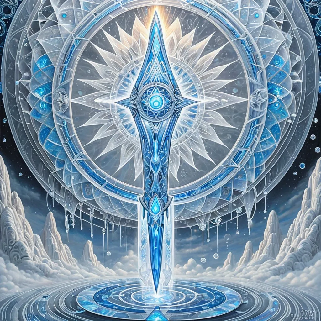 Epic visionary art: Ein schwebendes Kristallschwert aus reinem Licht , das durch einen undurchsichtigen Nebel schneidet und dahinter strahlende Klarheit offenbart. Umgeben von schwebenden Gedankenblasen die sich in klare geometrische Formen verwandeln. Stil: Alex Grey meets moderne Ikonenmalerei. Farben: Silber-Weiß-Palette mit elektrischem Blau und klaren Diamant-Akzenten. Im Hintergrund: Ein sich entfaltendes Mandala aus Wahrheits-Symbolen. --ar 2:3 --style raw --v 6 ,