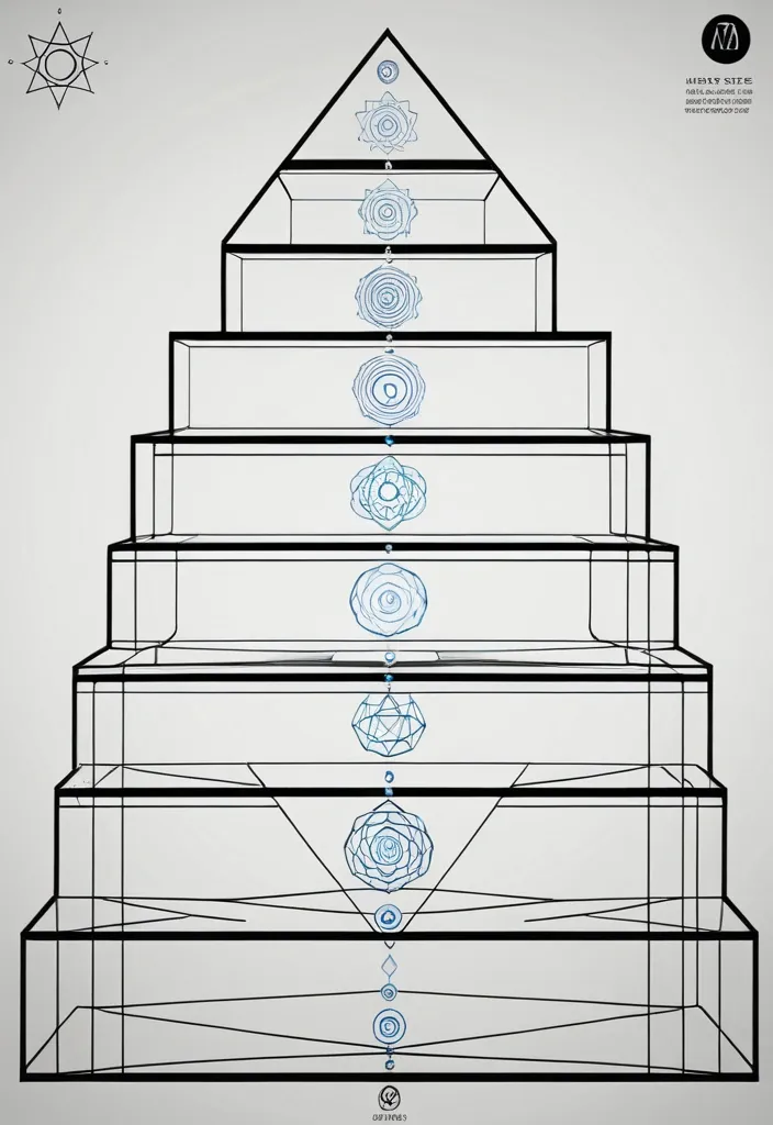 Masterpiece: Sacred geometry infographic: Eine siebenstufige Kristalltreppe die vom Erdboden zum Himmel aufsteigt. Jede Stufe repräsentiert eine Klarheits-Ebene mit ihrem Symbol: 1. Auge (Wahrnehmung) , 2. Gehirn (Gedanken) , 3. Mund (Wort) , 4. Herz (Gefühl) , 5. Hand (Handlung) , 6. zwei verbundene Kreise (Beziehung) , 7. strahlender Punkt (Sein). Klare Textintegration entlang der Treppe. Stil: Modern esoterisch mit klaren Linien und transparenten Ebenen. --ar 16:9 --style raw --v 6 ``` ,
